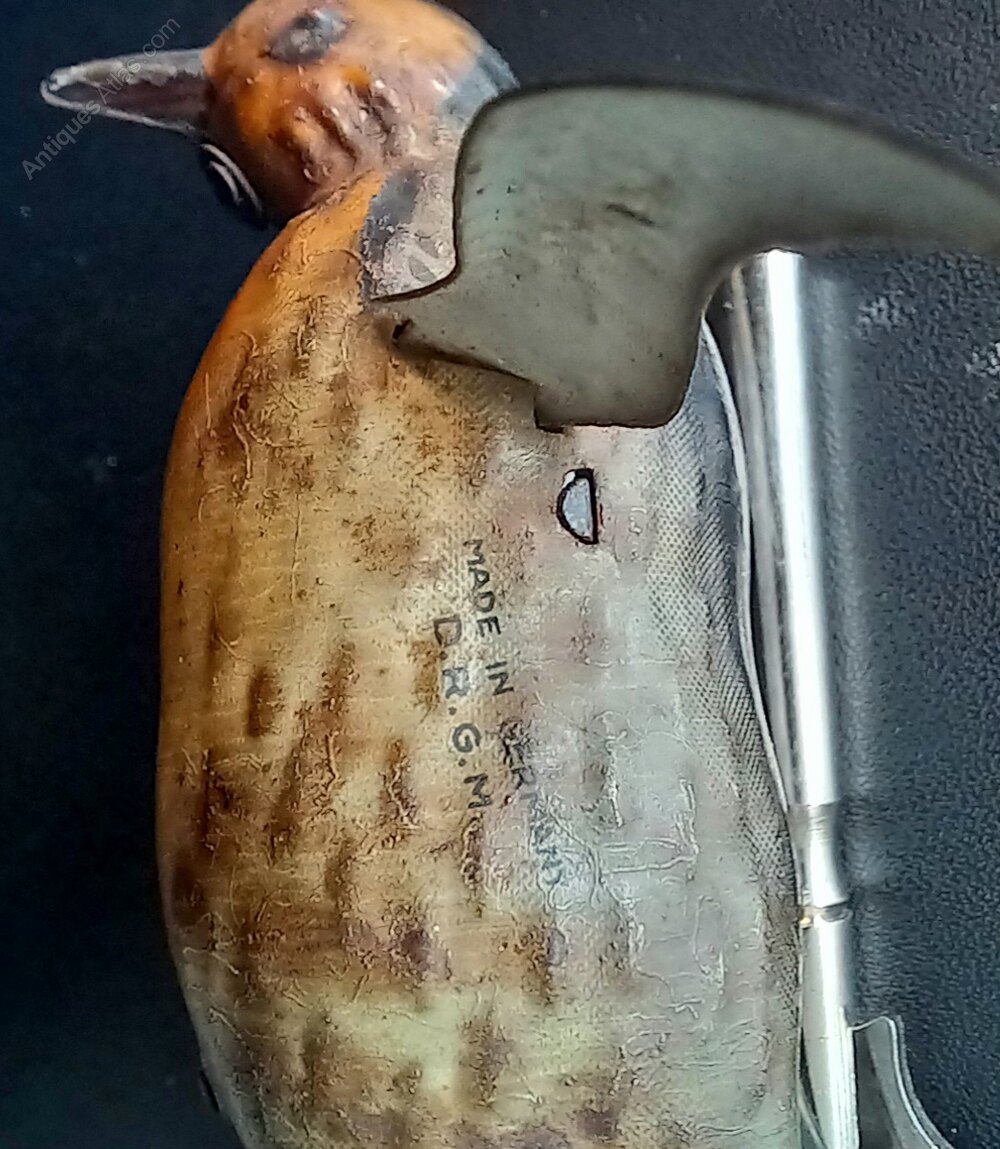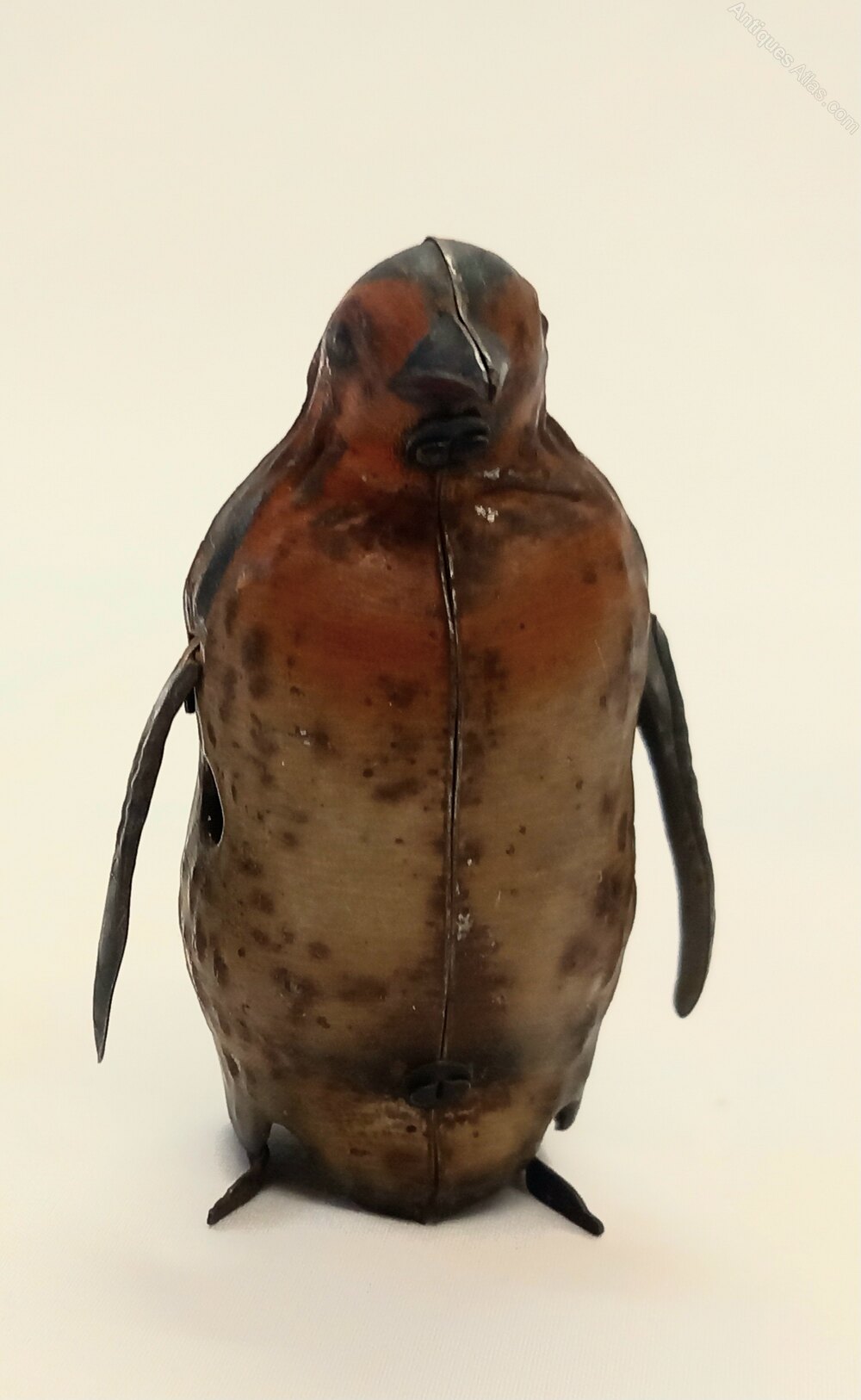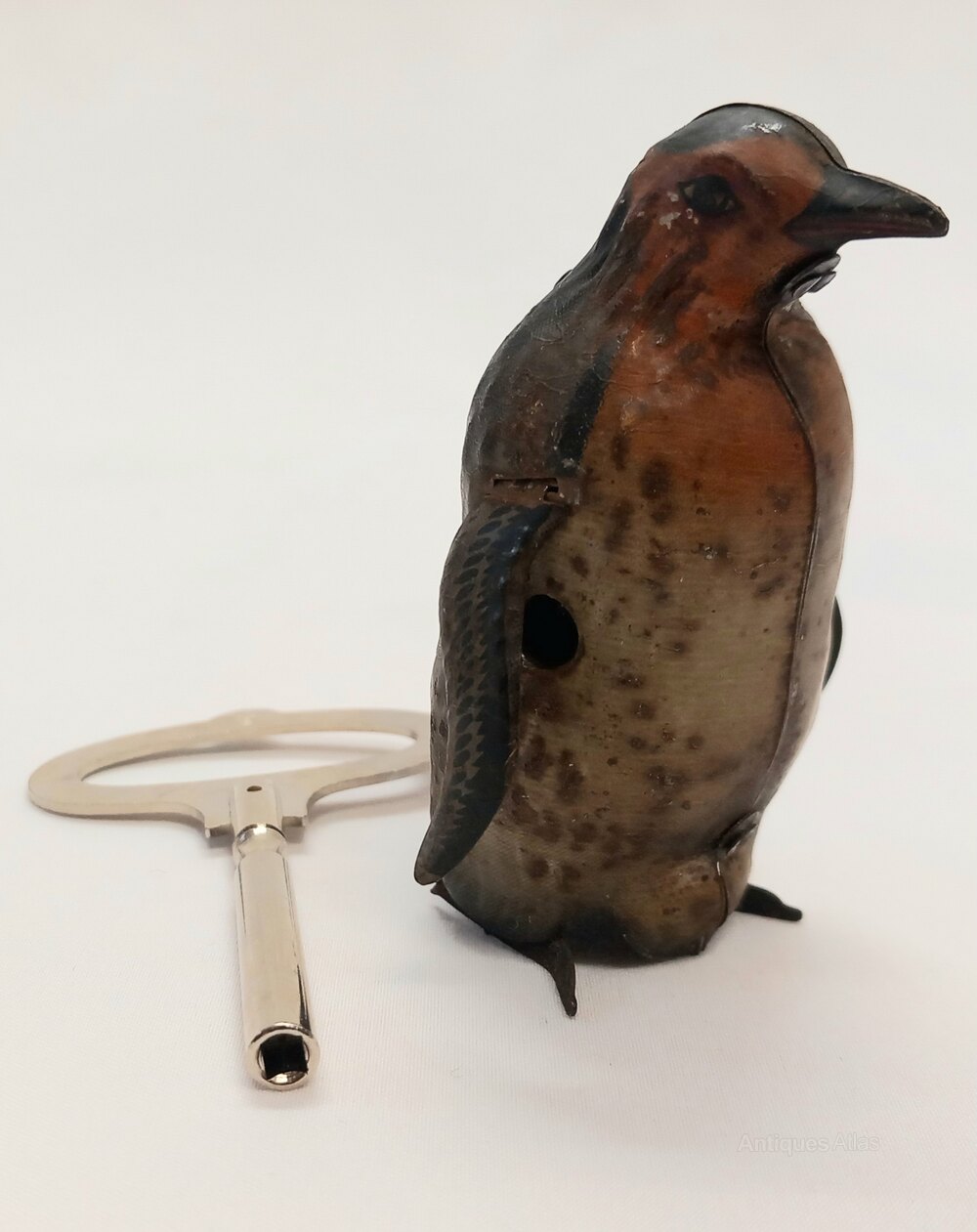 Tinplate clockwork waddling penguin, in working order with replacement 3mm key. A DRGM or Deutsches Reichs Gebrauchs Muster (German Reich utility model) from 1891 to approx. 1945.