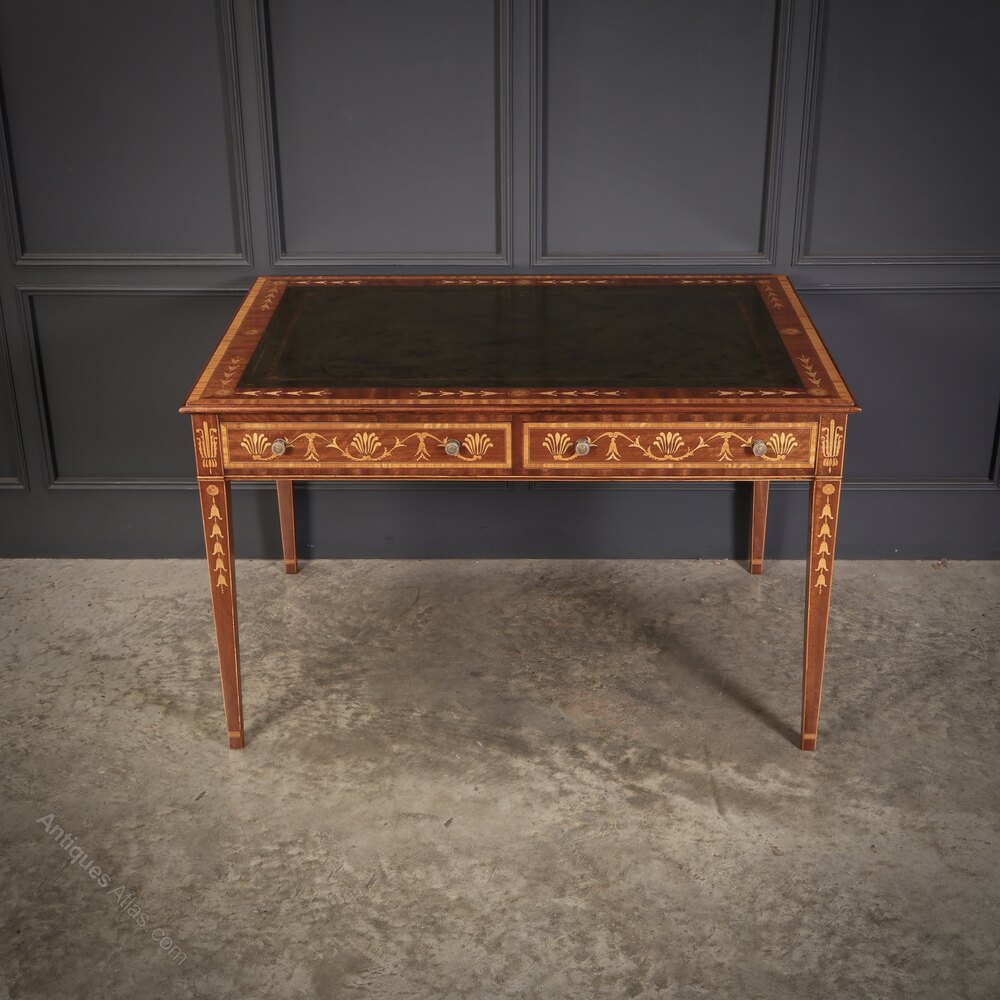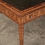 The top is fitted with a dark green leather writing surface, framed by a satinwood crossbanded border and decorative marquetry inlay.