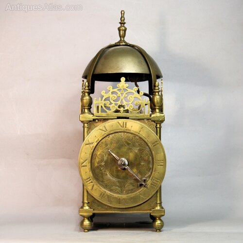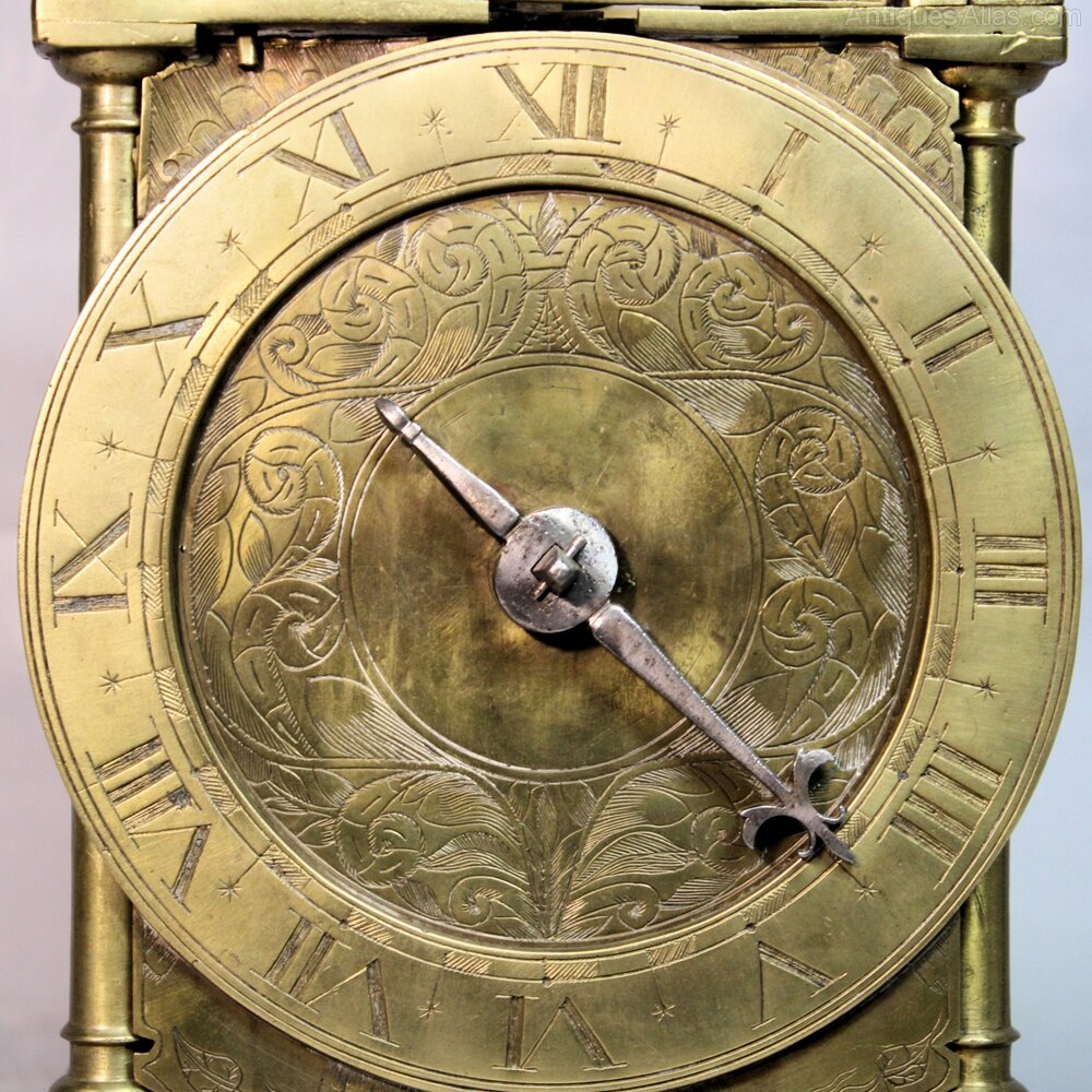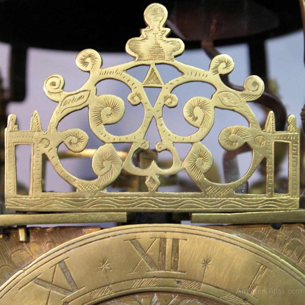 Condition Of good colour and of sound condition. The original balance wheel escapement has been converted to the much more accurate Verge and short pendulum escapement. All of the alarum work and setting disc are missing as are the doors, iron backplate, pendulum rod and bob, chains and weights. The top finial is a later replacement and the sprocket centres have been modified to take chain. The bell are carrier are replacements and the back left finial is a matched, turned replacement. it is believed that 99% of lantern clocks have fallen from the wall at least once in their lifetime. This is the reason why so many of them have damaged or missing parts they are heavy and landing upon a hard floor would without doubt, cause at least some damage.