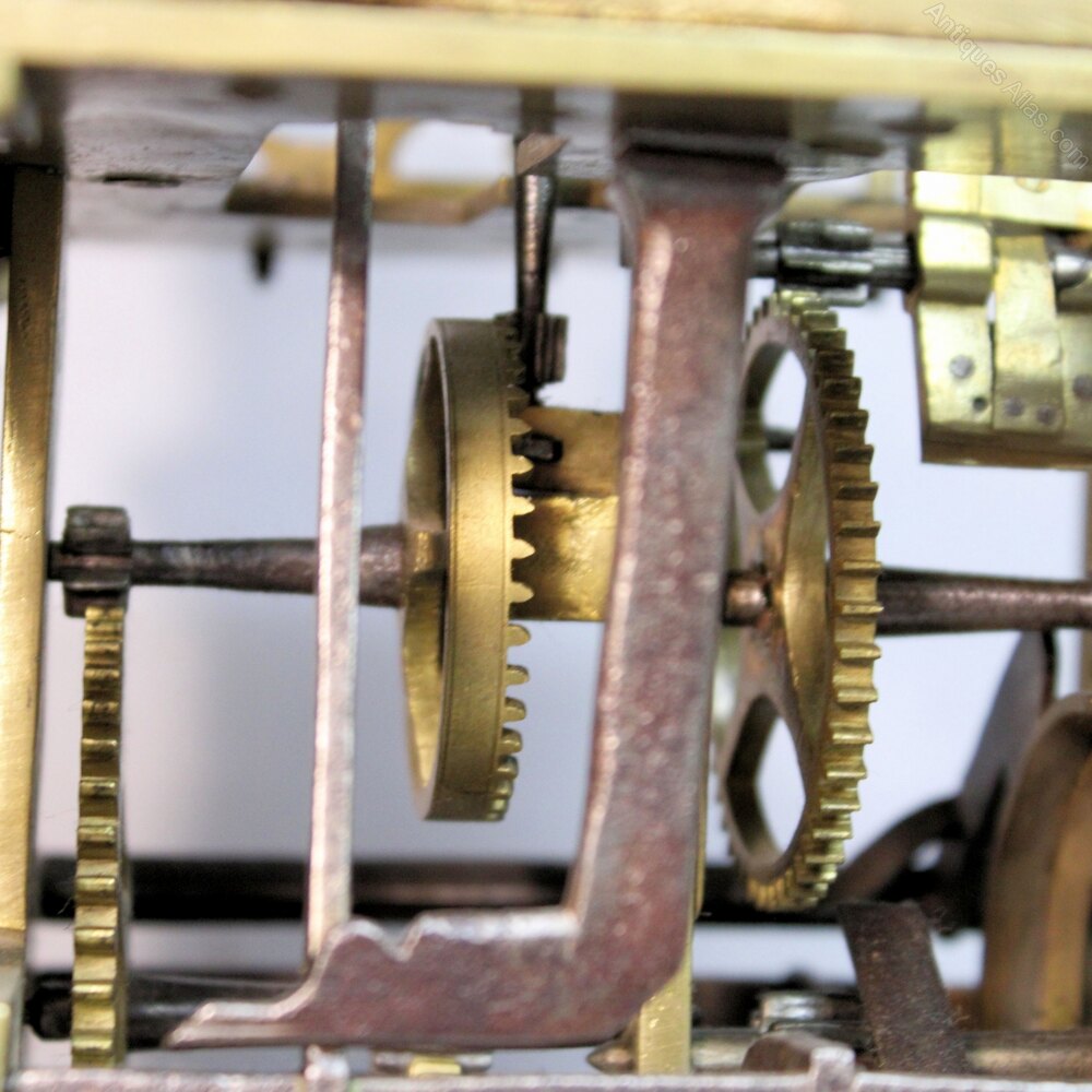 The short duration movement (9, 12 or 15 hours) with separate winding sprockets to both trains. Having tapered and un-colleted arbors mounted in substantial upright plates. Now having a short pendulum, French style, verge escapement with a low count crown wheel. Also, countwheel striking on the top-mounted, smooth-cast bell that is hung from a cross strap with finial and sprung between the corner finials. The hammer head is extremely substantial and has a formed rod.