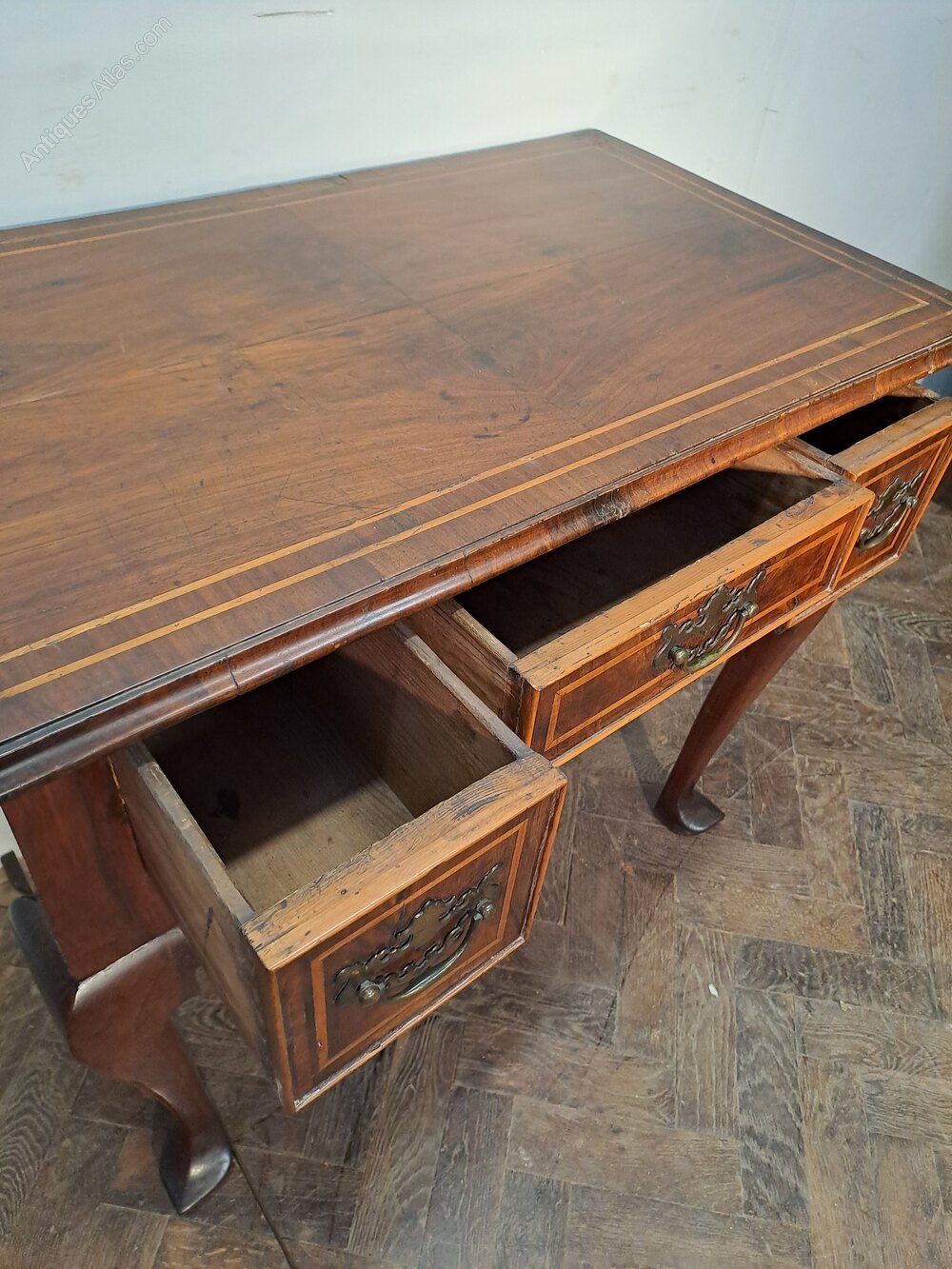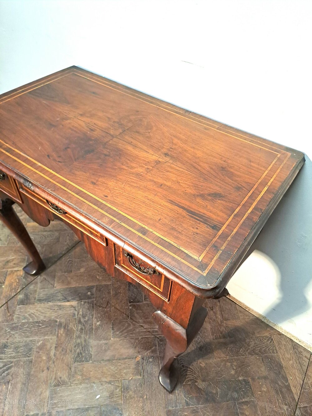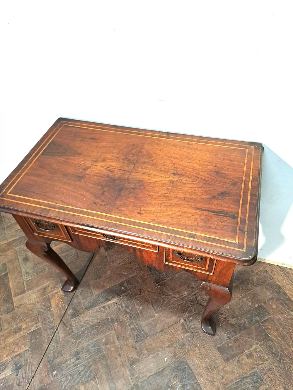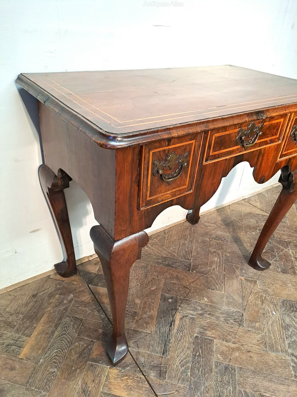 Hutton-Clarke antiques is pleased to offer an early 18th Century Walnut Lowboy with strinhing.Standing on finely shaped cabriole legs terminating in pointed pad feet. The piece features a well-figured walnut quarter veneered top with delicate stringing, above a shaped apron and three drawers fitted with period-style brass handles and escutcheons. The drawer fronts are framed with fine stringing, adding refinement and highlighting the quality of the walnut veneers.