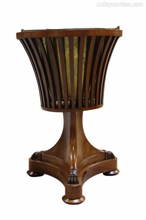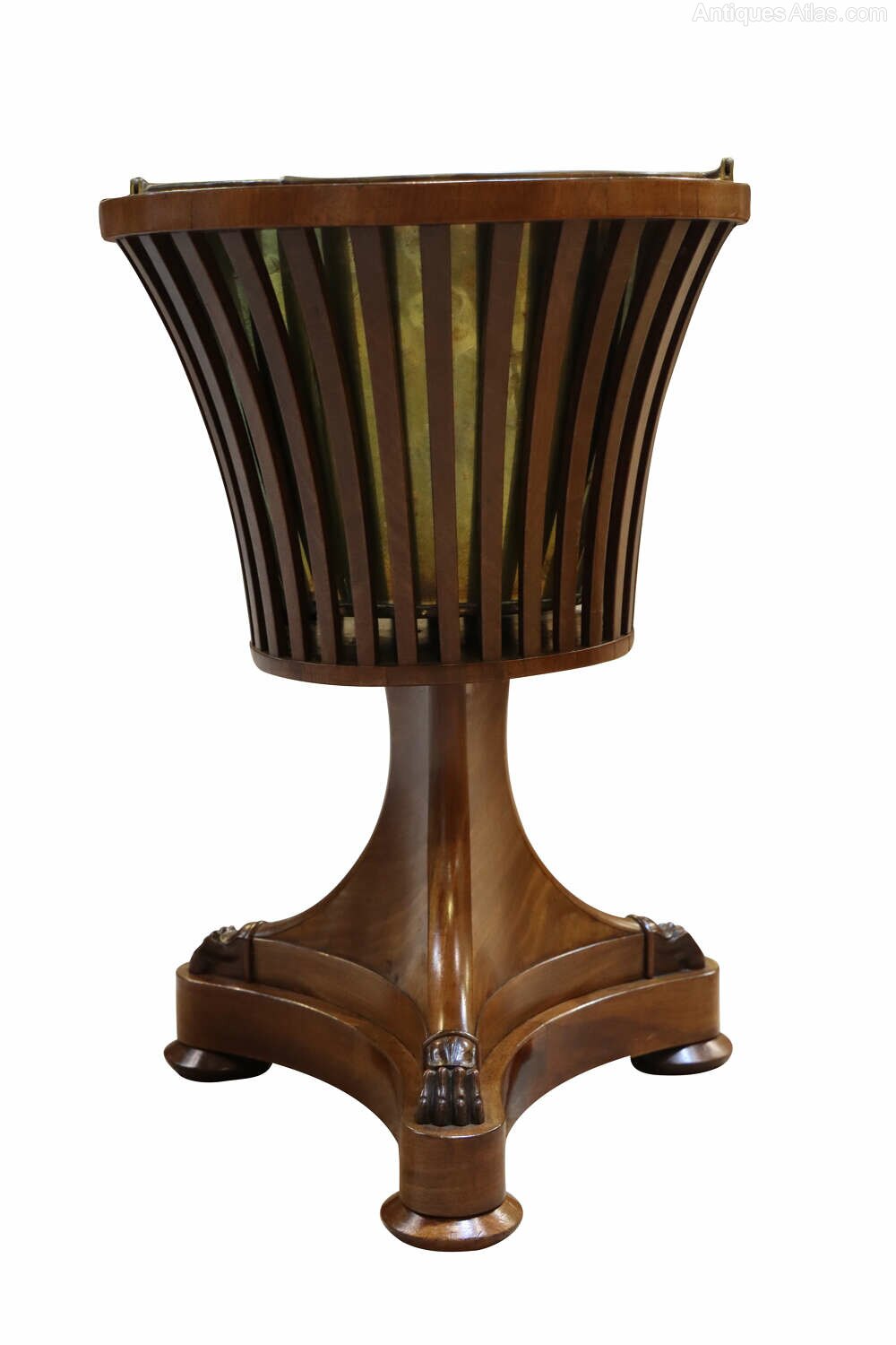 This antique mahogany jardinière combines neoclassical grandeur with practical elegance, appealing to collectors of Empire furniture and decorative interiors.