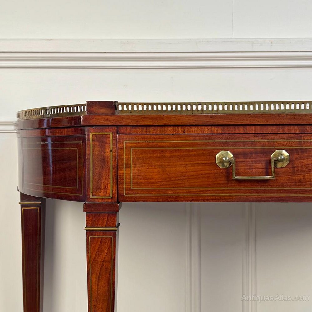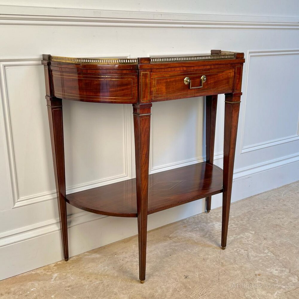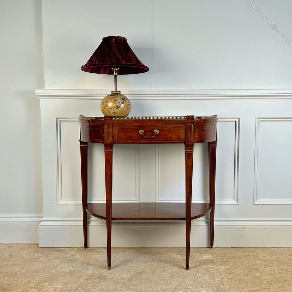 A small 19th century 2 tier mahogany console table, inlaid throughout with brass line decoration. Having a shaped top with lacquered brass gallery rail. The single drawer beneath all oak lined with original handle. The whole and raised on tapering legs and terminating in brass ball feet. Lovely, condition, colour and original finish throughout. Regency, Circa 1810.