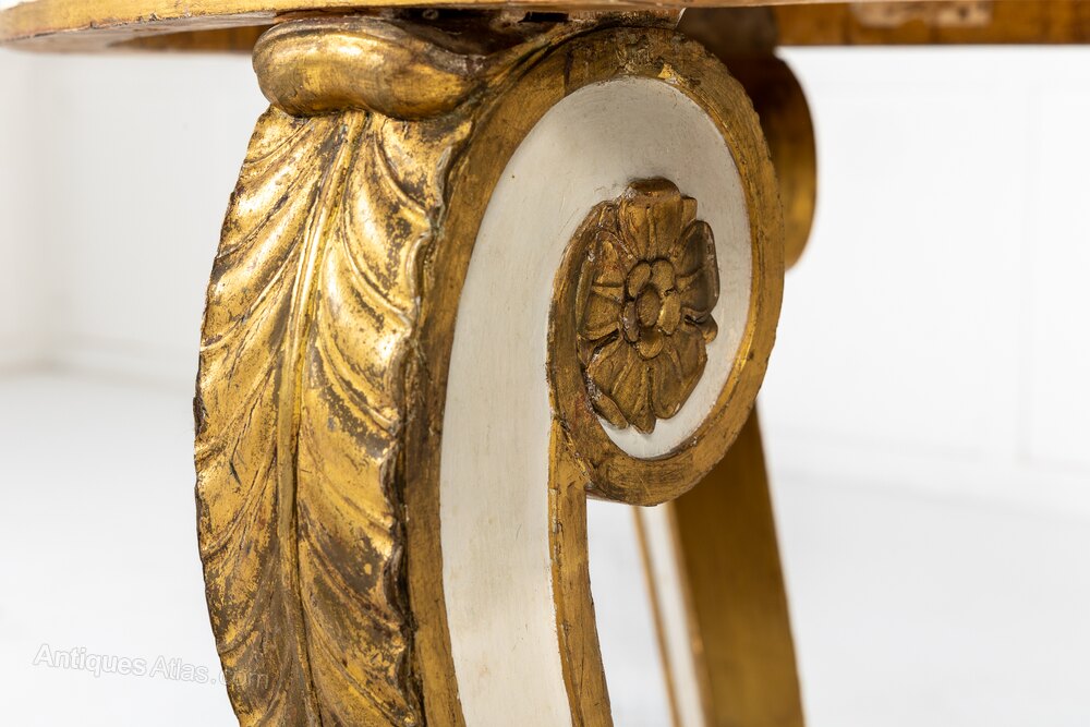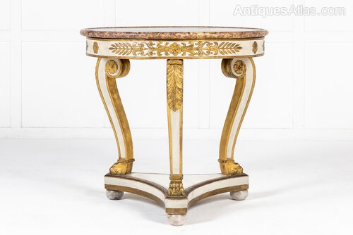 The fine marble top supported on a white painted frieze with parcel gilt decorative details of typical Empire type and very fine quality. These details incorporate Grecian revival classical motifs such as acanthus, six petalled flowers and scrolling foliage and the frieze is banded in gilt at the top and bottom. Three scrolling supports terminating in lions' paw feet descend to a tripartite platform supported on bun toes.
