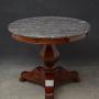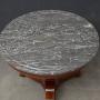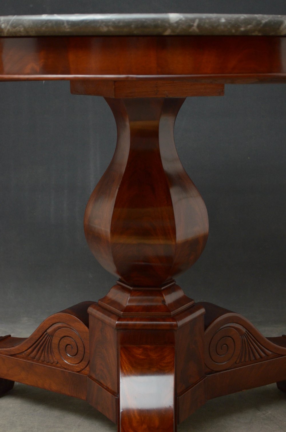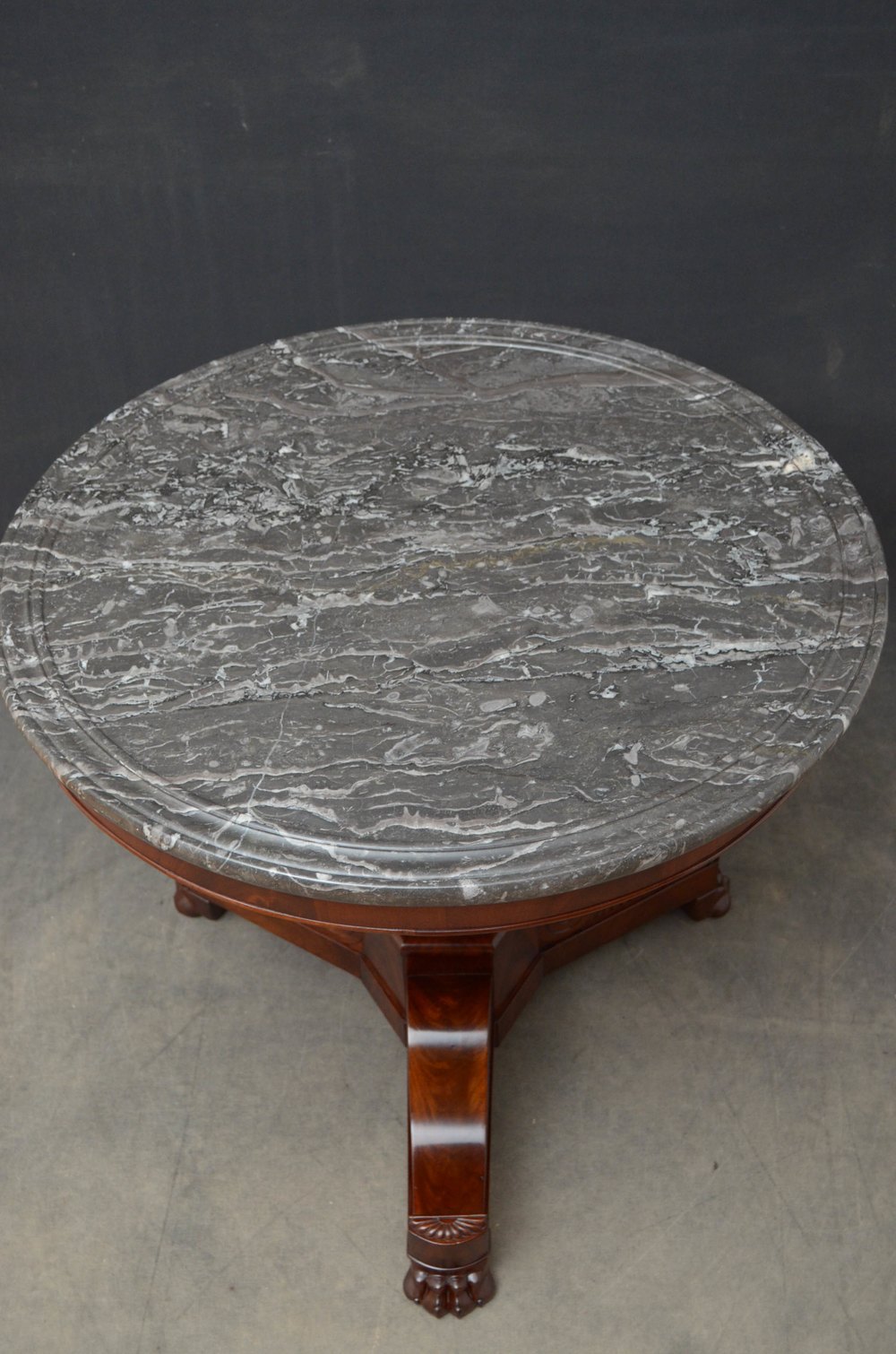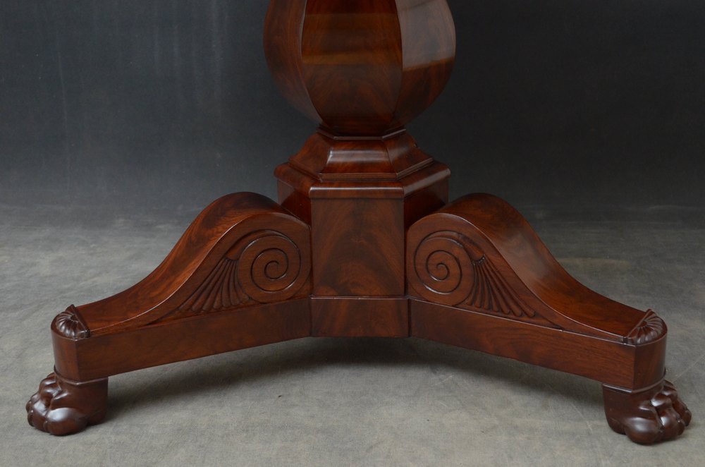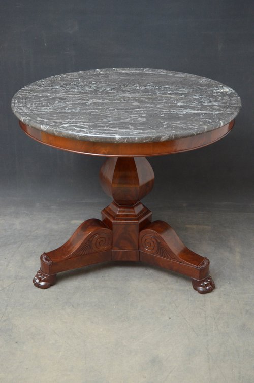 Sn5217 A XIXth flamed mahogany William IV centre table / gueridon with excellent grey-white marble top and moulded frieze, standing on vase shaped, flamed mahogany column and curved flat facetted support with 3 outswept carved legs terminating in paw feet, all in excellent condition throughout, ready to place at home. c1830