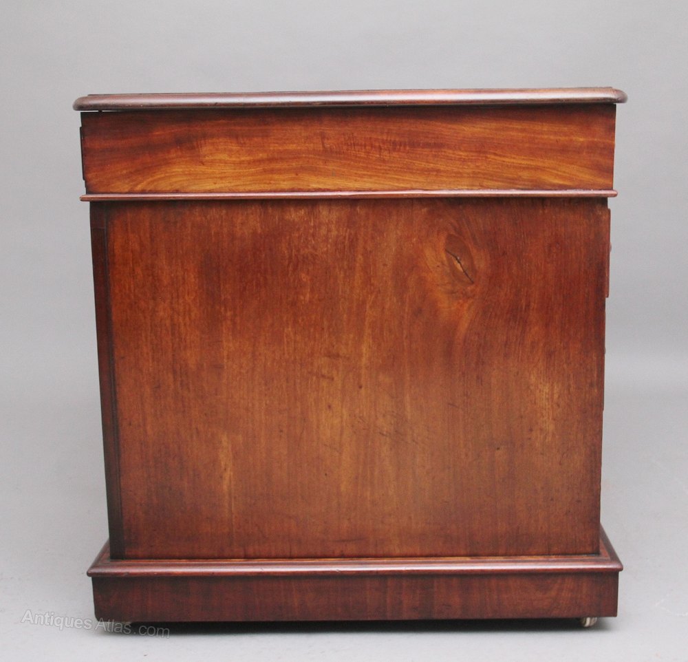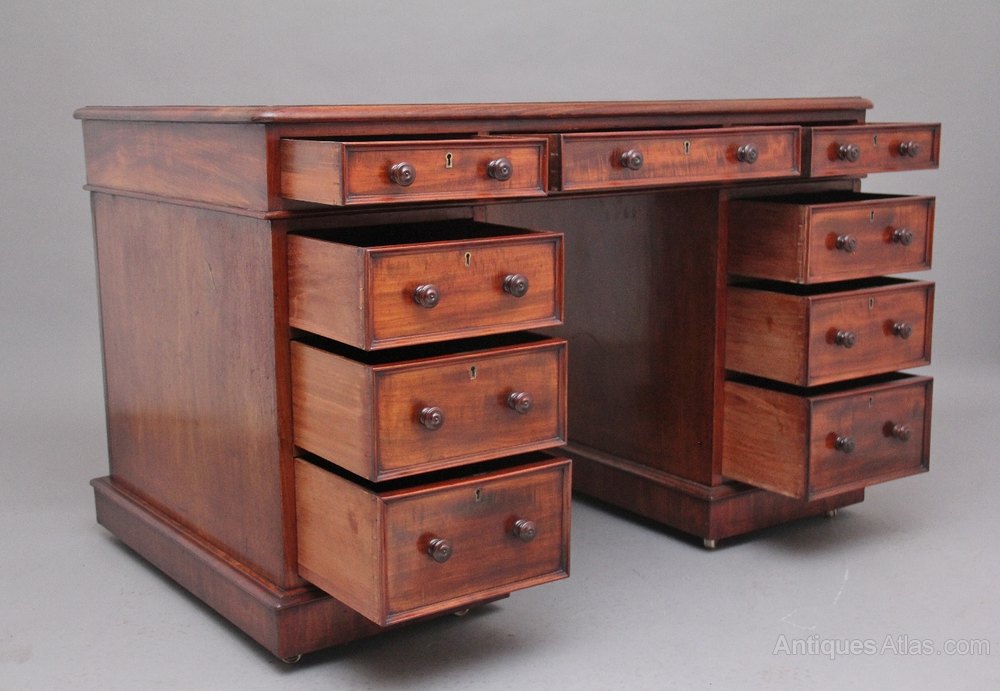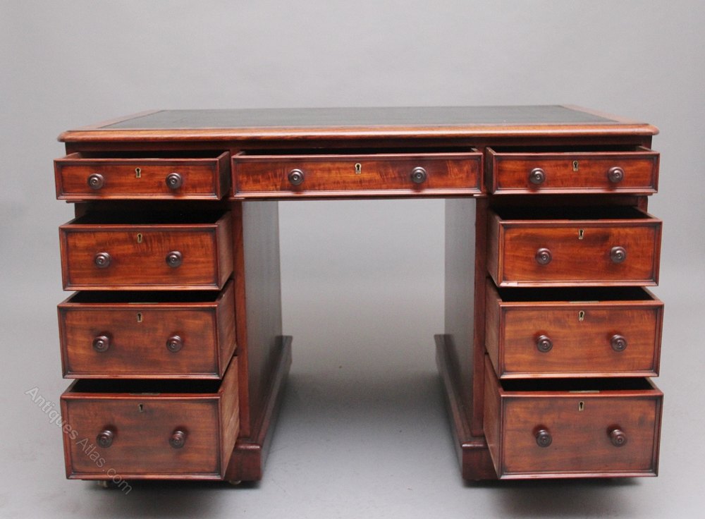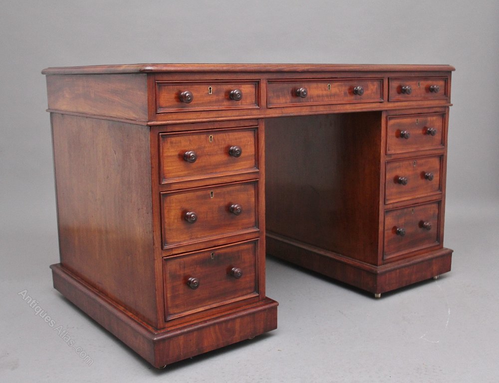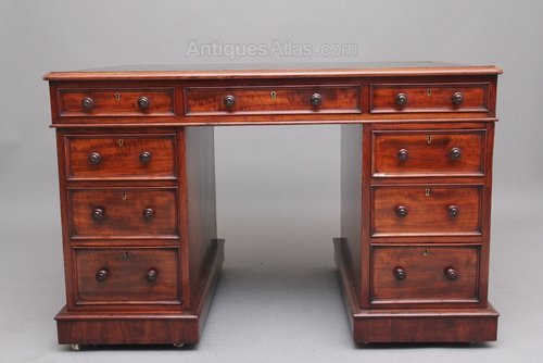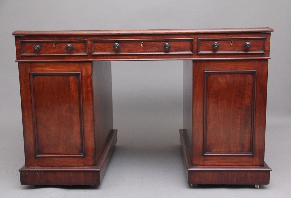 A superb quality early 19th Century mahogany pedestal desk, the moulded edge top having a green leather writing surface decorated with gold and blind tooling, the desk has an arrangement of nine graduated mahogany lined drawers with the original turned wooden knob handles, the back of the desk having three faux drawers on the top section whilst the pedestals are panelled, supported on a plinth base. The desk is in fantastic condition and has a lovely warm mahogany colour. Circa 1840.