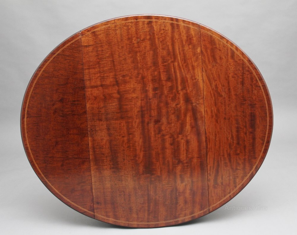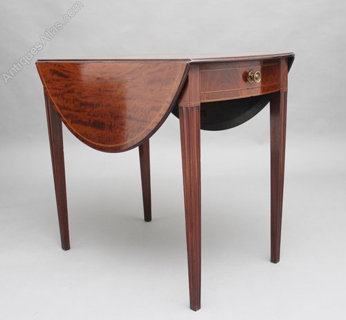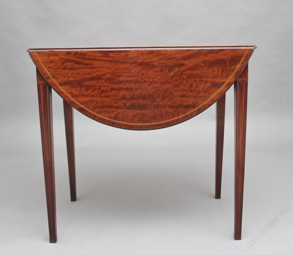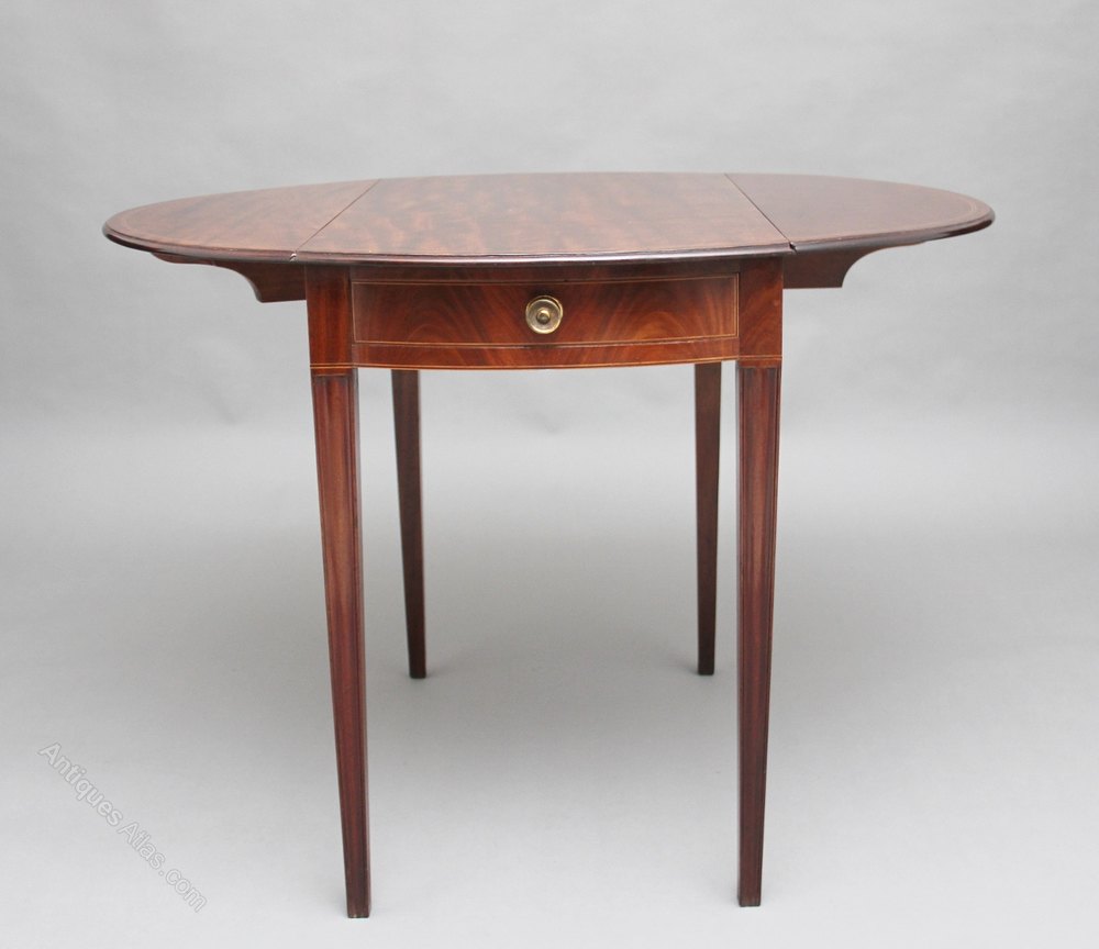 Early 19th Century mahogany Pembroke table, the lovely figured drop leaf top with a moulded edge and inlay decoration, a single mahogany lined drawer at one end with a turned brass handle, the drawer front also having inlay decoration, supported on four tapering fluted legs. Circa 1810.
