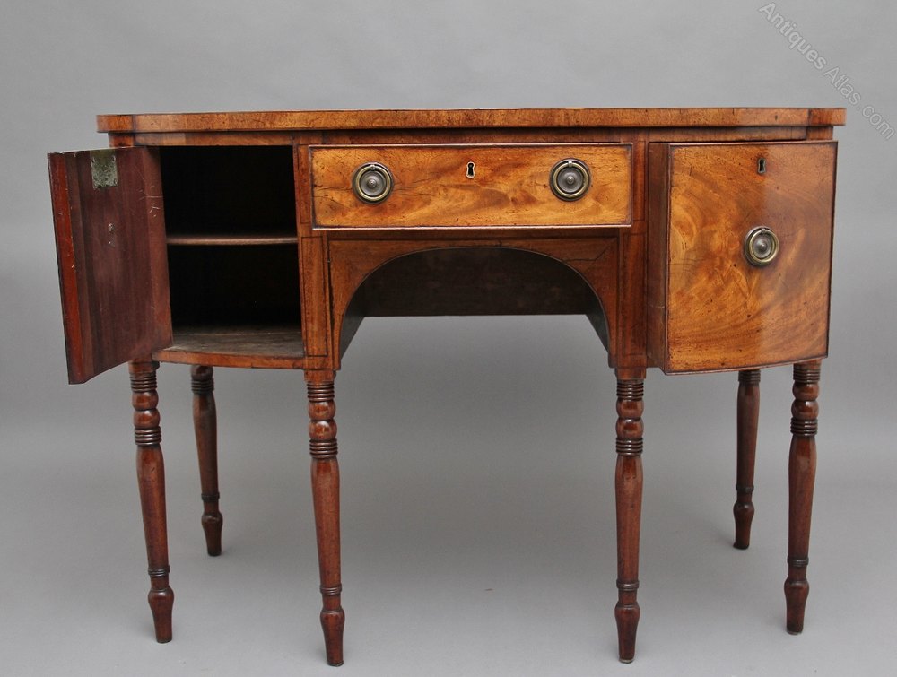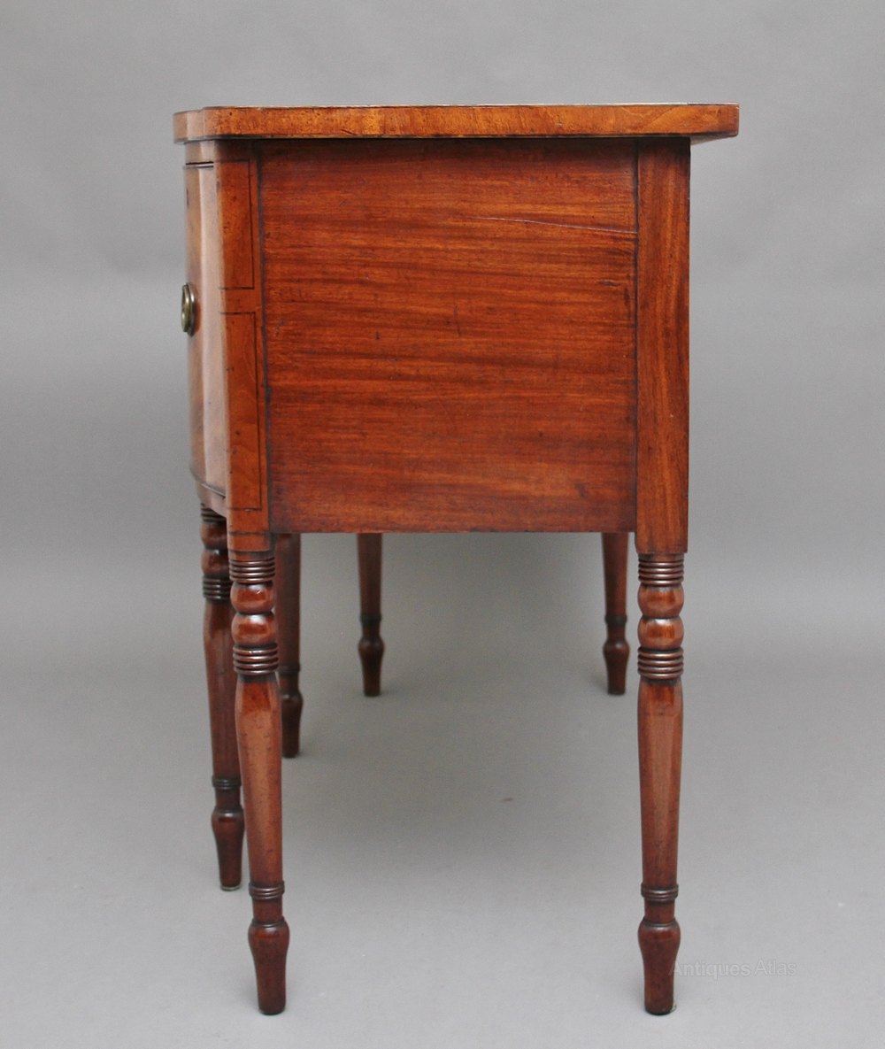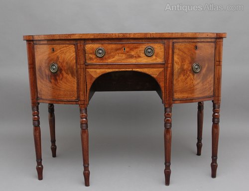 Early 19th Century mahogany bow fronted sideboard, the shaped top above a fitted central drawer flanked by a cupboard and an oak lined deep drawer, the sideboard having original brass ring handles, supported on six ring turned tapering legs. Lovely rich warm colour and in excellent condition. Circa 1820.
