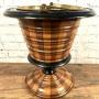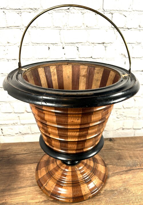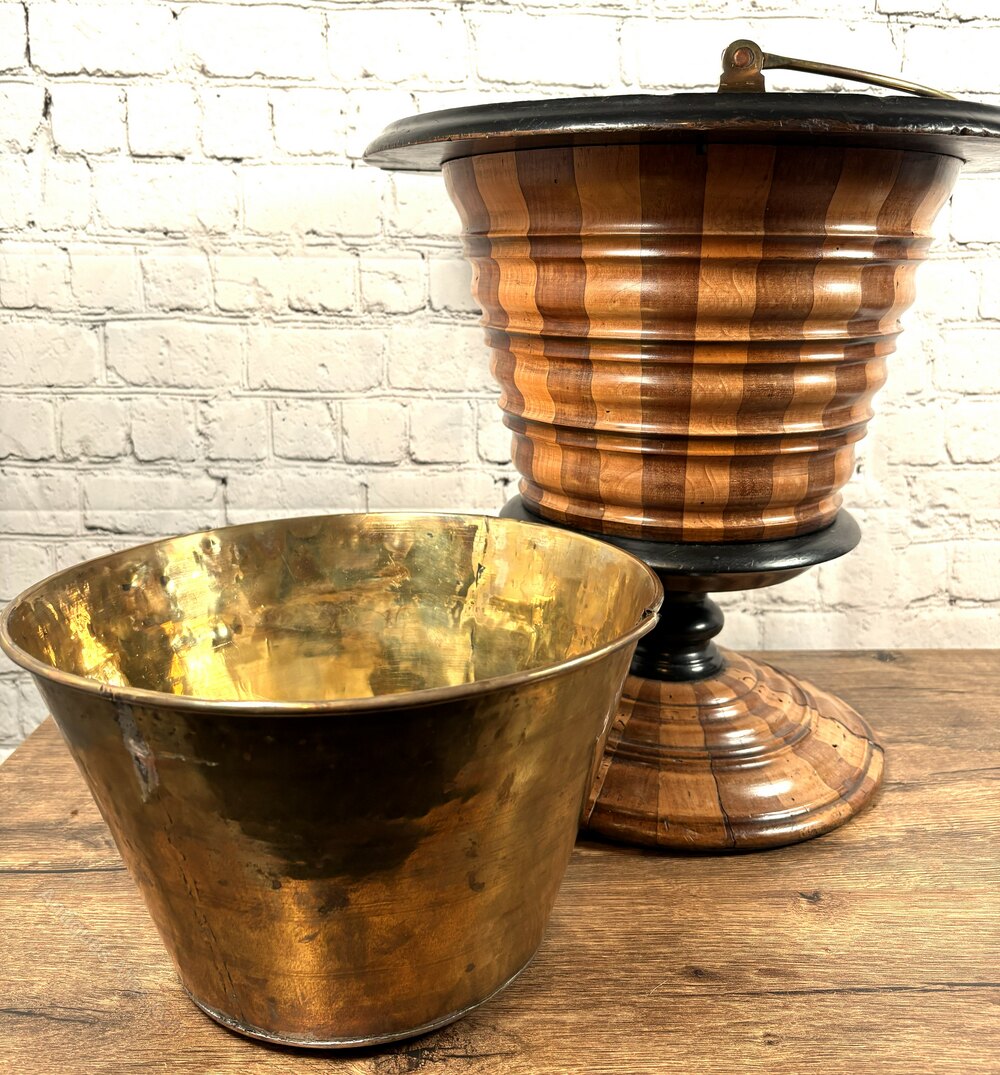 Here we have a super quality early 19th Century Dutch 'Teestoff' - literally translates as a tea stove bucket for hot coals - of alternating fruit wood staves with an ebony rim and pedestal and is complete with original brass liner and hoop handle, sits flat where three turned feet would have been.