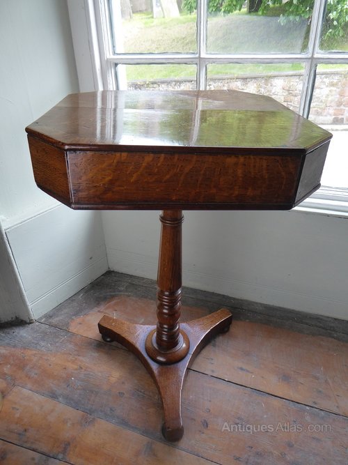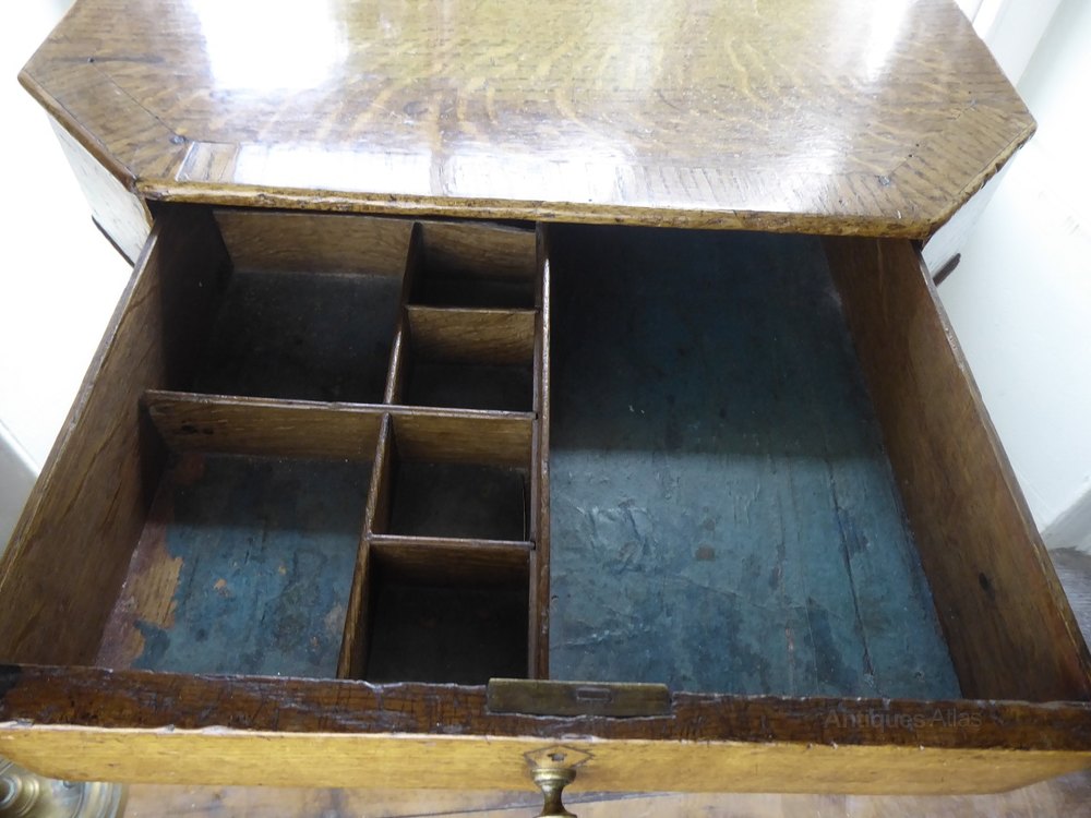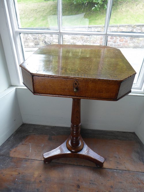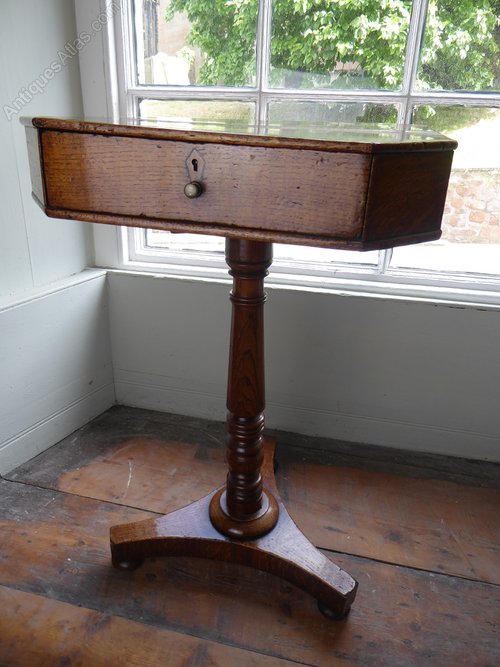 The table is a lovely colour, with a single drawer and various sized compartments. Circa 1830.