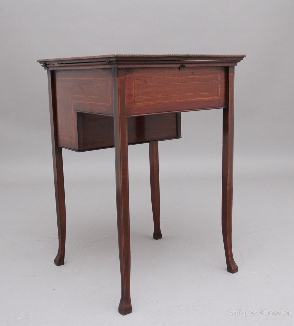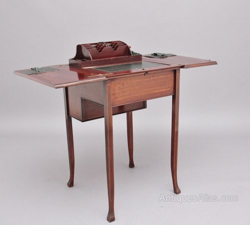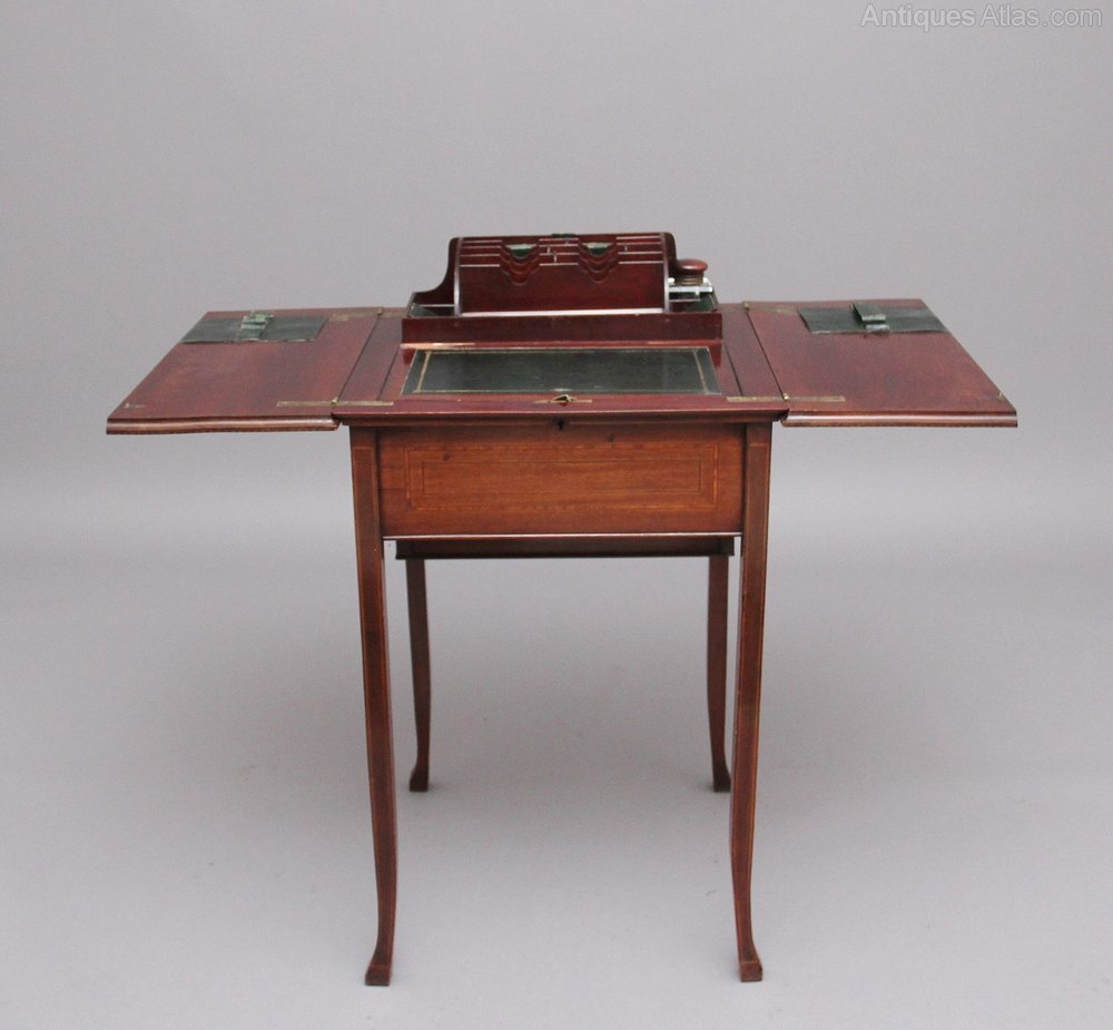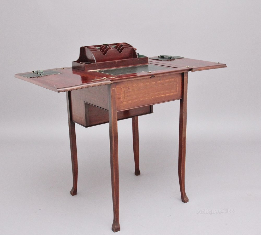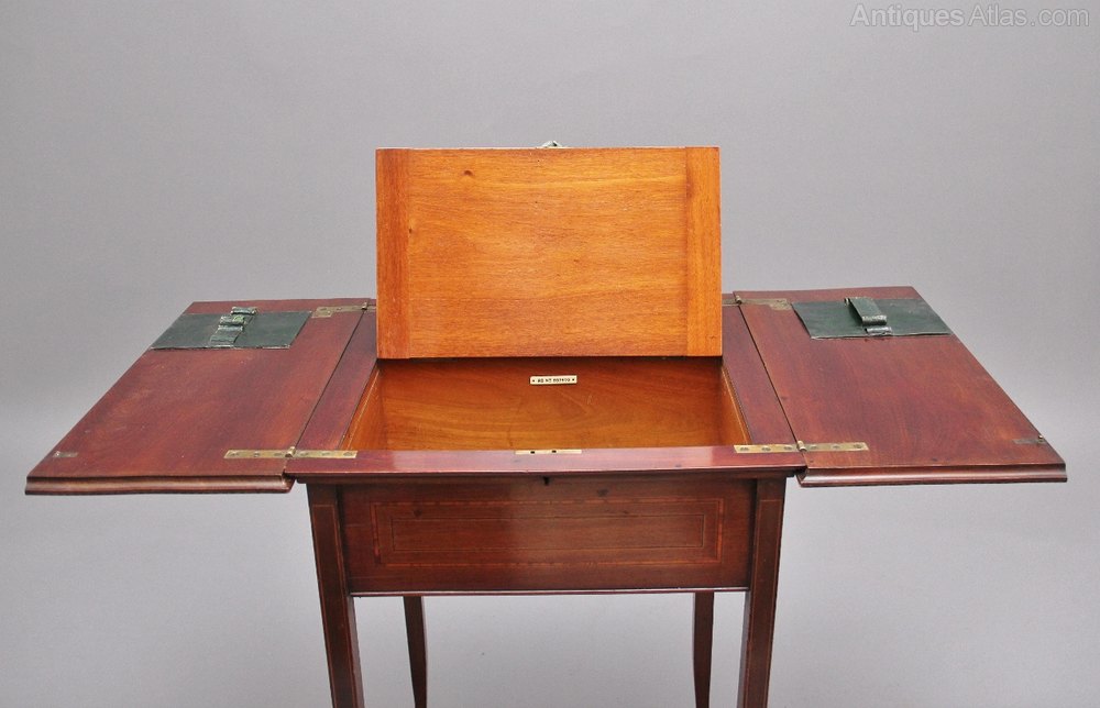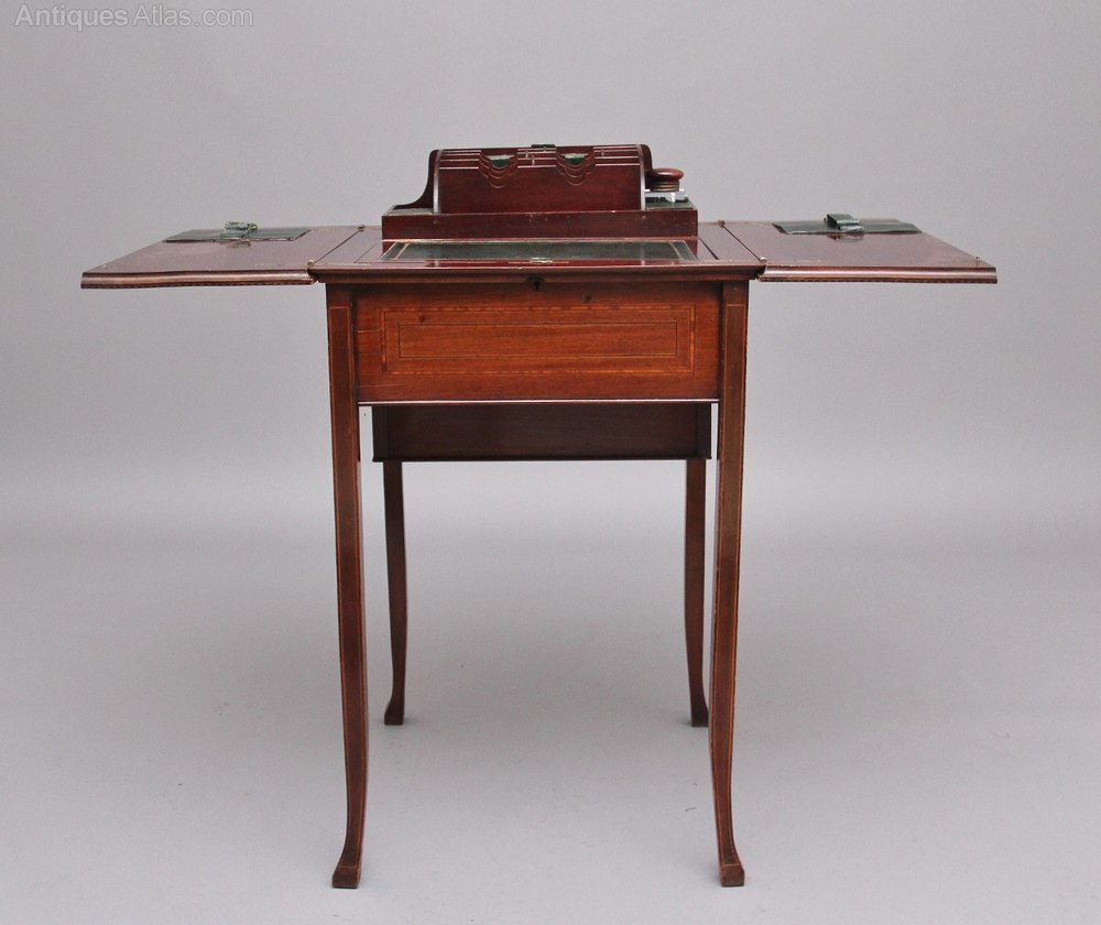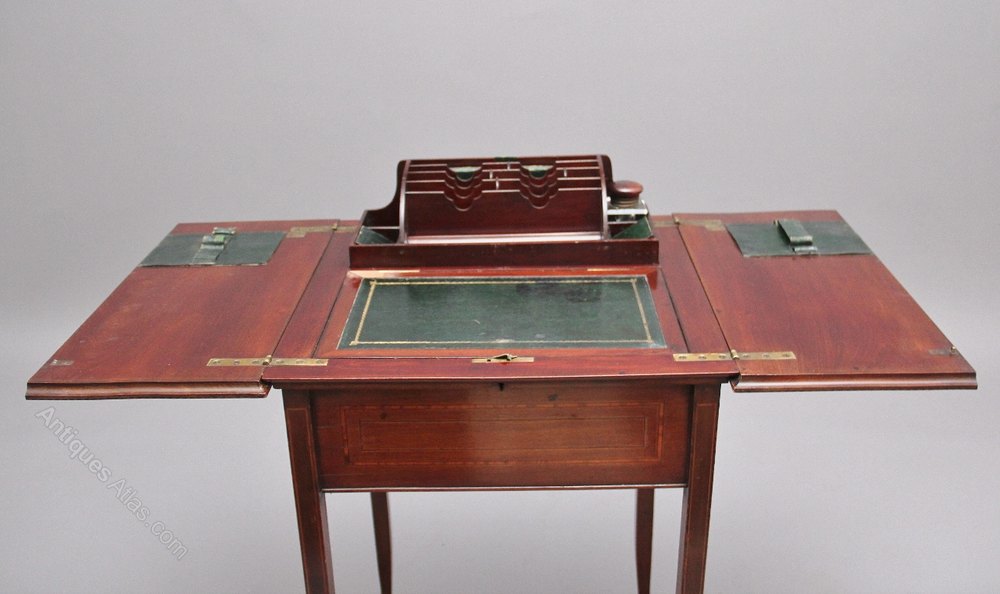 Early 20th Century mahogany metamorphic writing table, the square and inlaid top lifting up and folding over to reveal the rising writing desk top, which consists of a green lather writing surface, ink wells and various compartments, the leather writing surface lifts up to reveal a further compartment space, all sides of the table having decorative inlay and is supported on square slender tapering legs. Circa 1910.