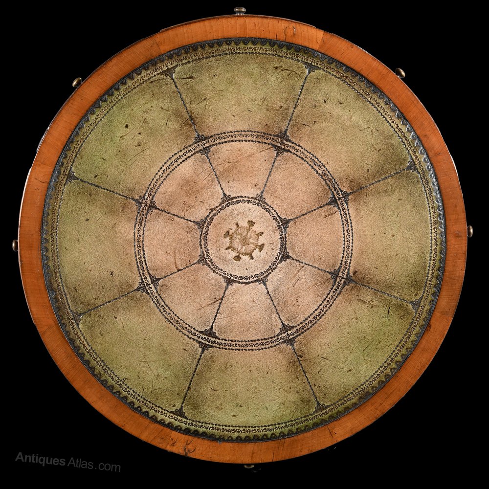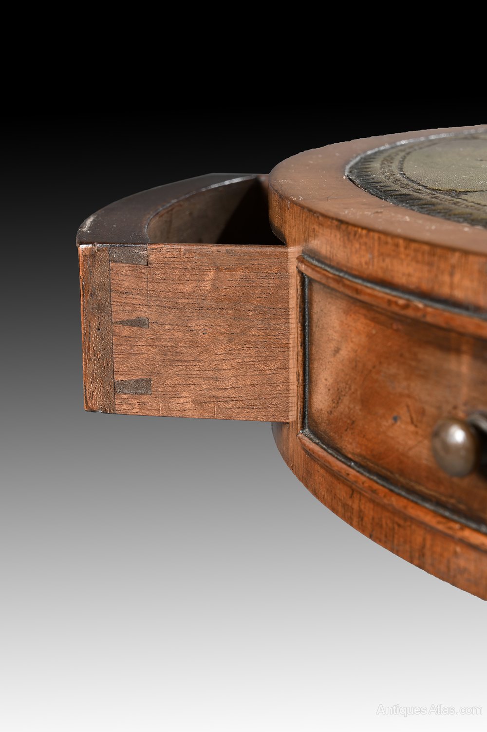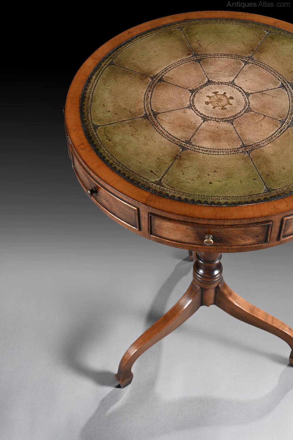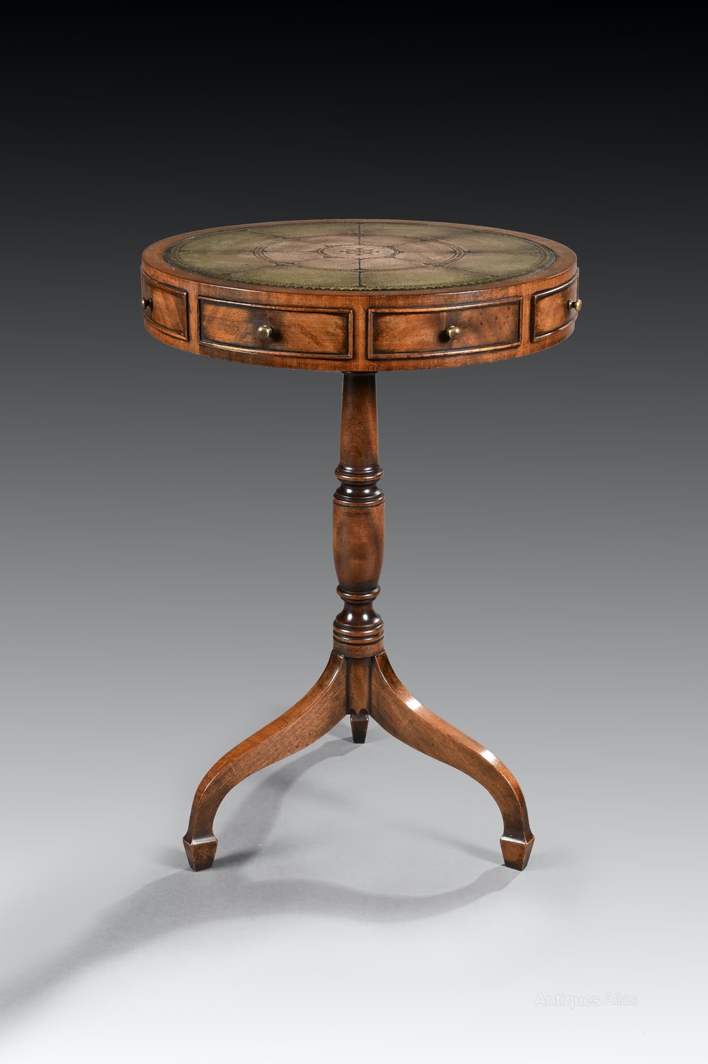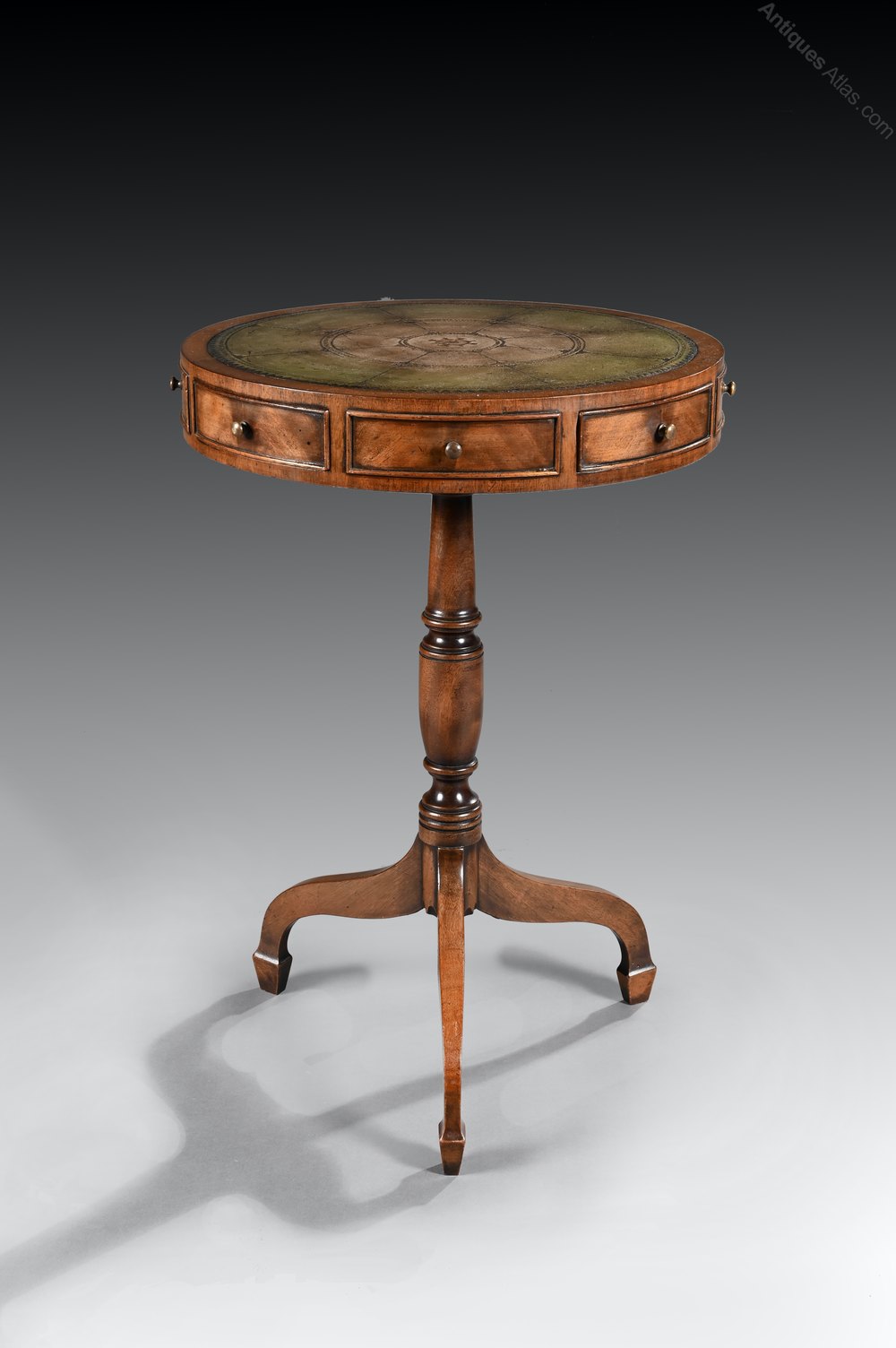 Of elegant small proportions, this well constructed drum table has a newly fitted gilt tooled leather insert to the revolving top. The frieze having four mahogany lined drawers with four false drawers each cockbeaded with a brass knob handle. The drum table is supported by a central ring turned baluster column with three down-swept legs terminating on spade feet.