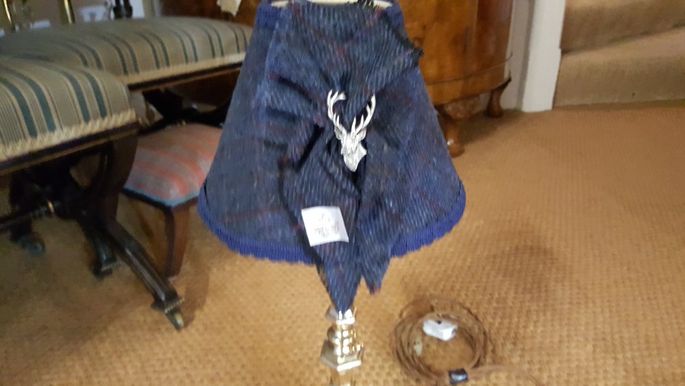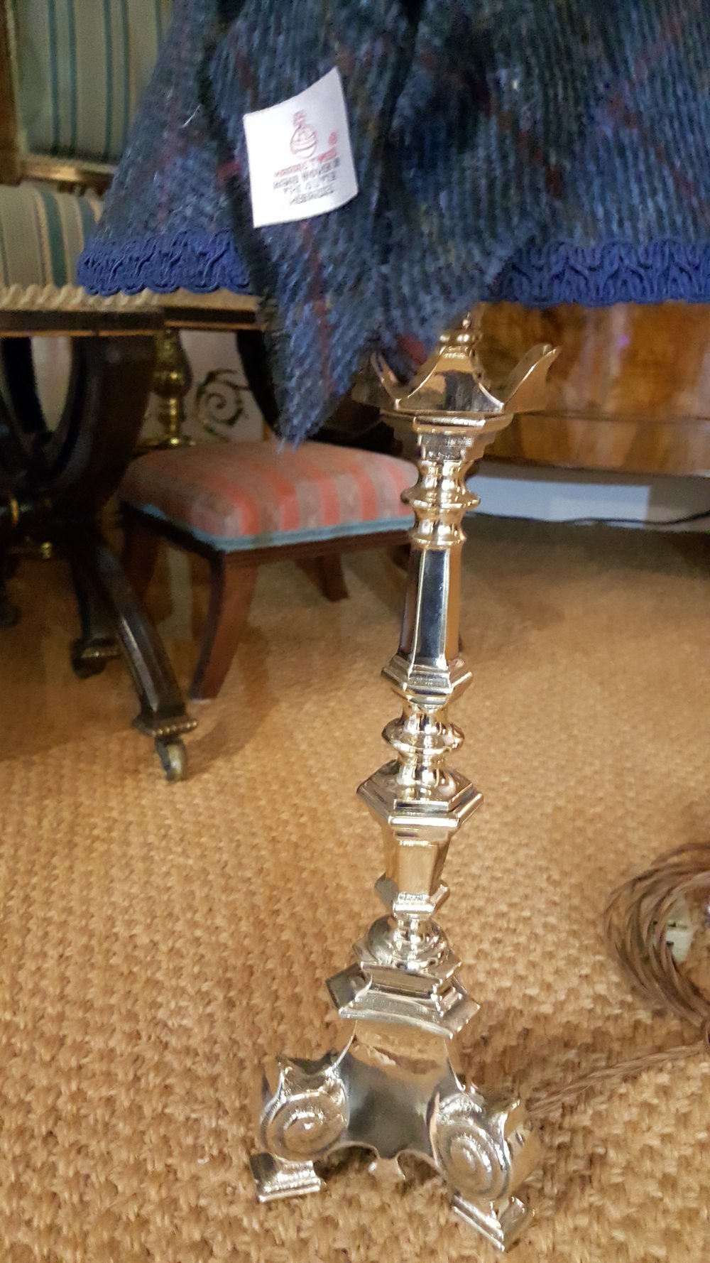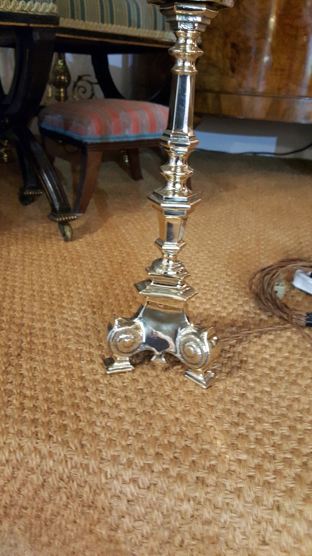 Early 20thC Brass Alter Stick of gothic form converted to table lamp with Harris Tweed shade 9"diam x 21"h - all lights and lamps have been rewired with authentic corded flex, fitted with either foot switch or finger clicker switcth and are Pat tested