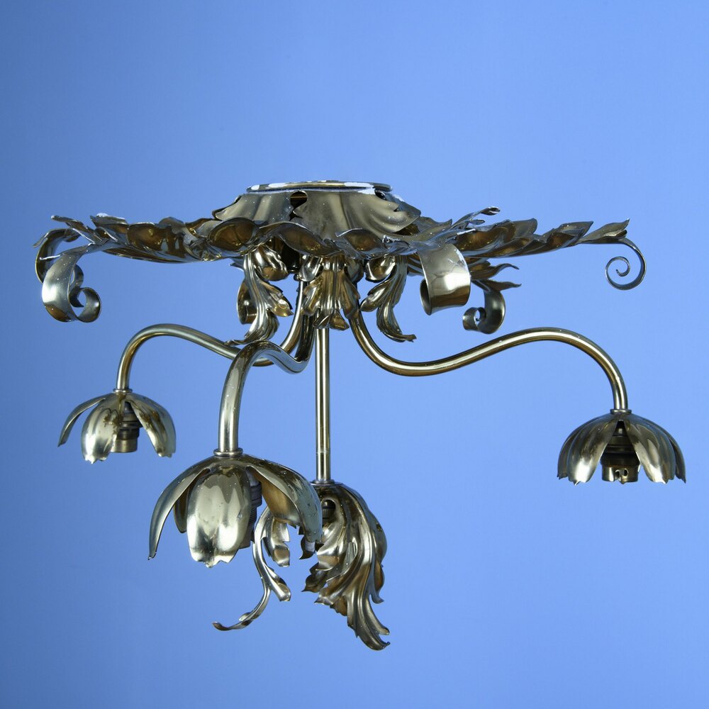 Early 20thC Brass Ceiling Lamp fitting with 3 Arms plus central fittiting all Decorated with Acanthus Leaves - attributed to F&C Osler - all lights and lamps have been rewired with authentic corded flex, fitted with either foot switch or finger clicker switch and are Pat tested