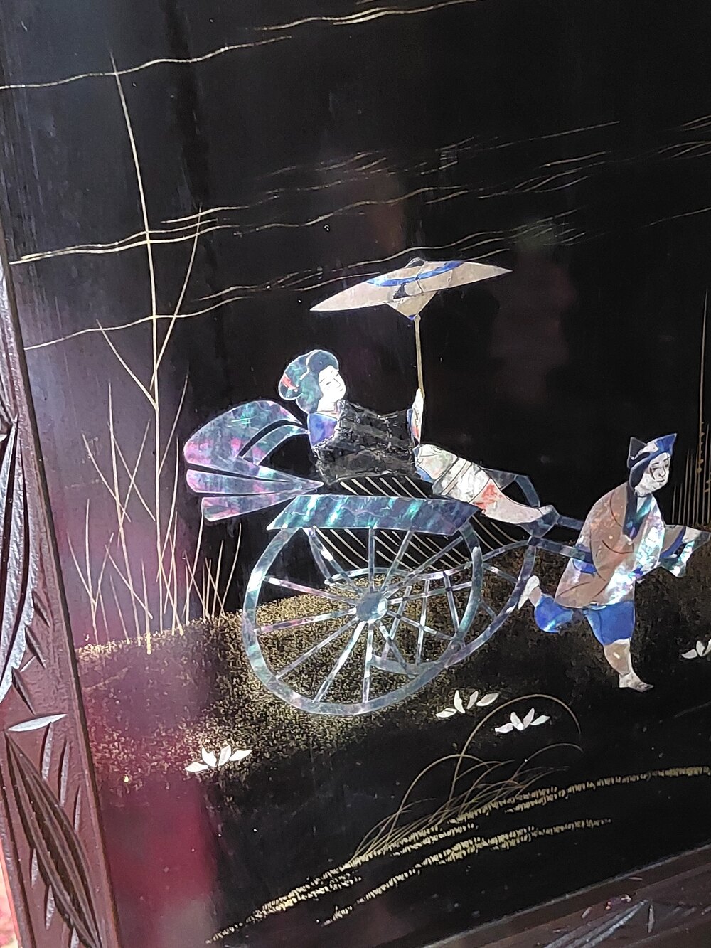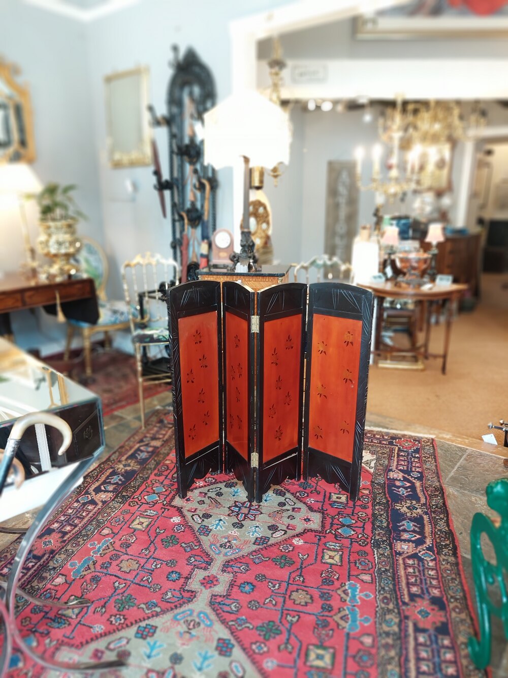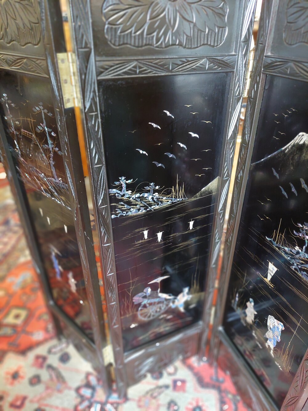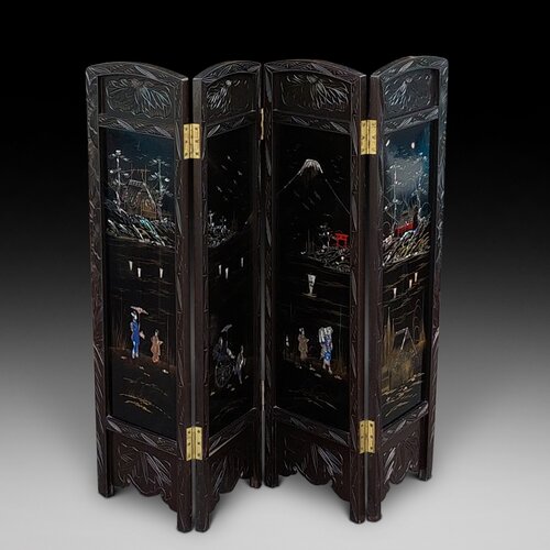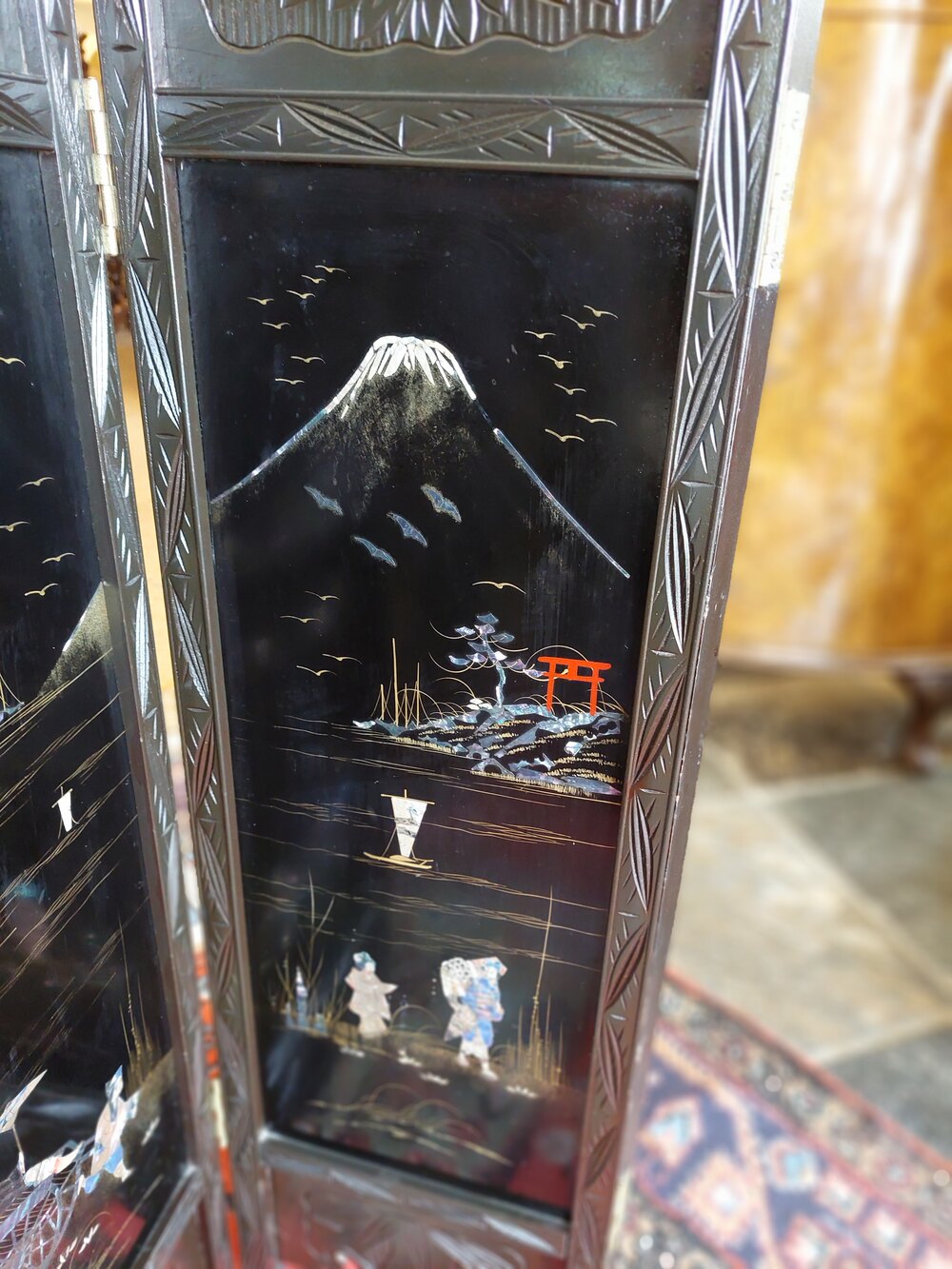 Early 20thC Japanned Lacquered 4 fold Fire Screen - with depictions of Mt Fuji, Torii Shrine Gate, and Cherry Blossom - 10.5"w x 35"h each screen