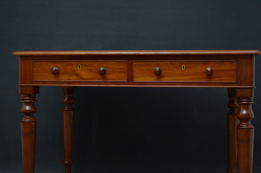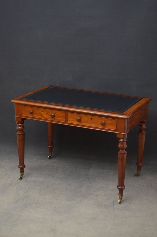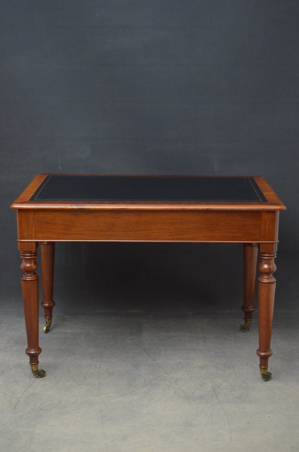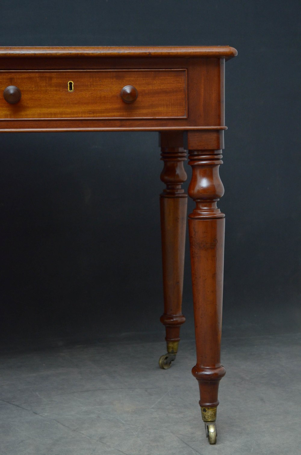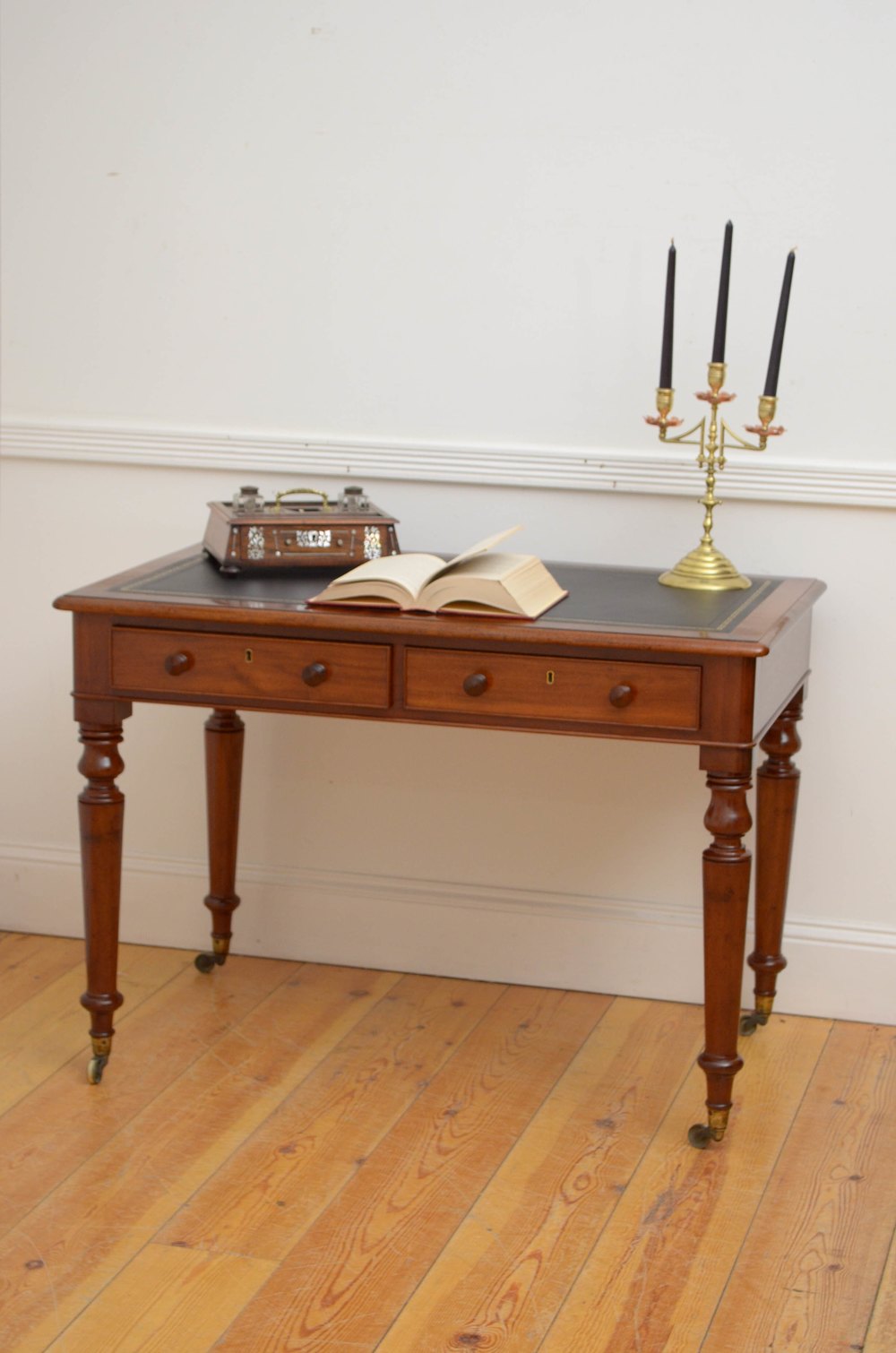 Sn5129 Fine quality early Victorian writing desk in mahogany, having black tooled leather top and two cockbeaded and mahogany lined drawers fitted with original turned knobs, standing on turned, carved and ring tapering legs terminating in original brass castors. This antique writing table is polished to each side enabling free standing, all in excellent home ready condition. c1850