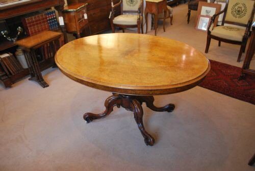 This is an oval table and will seat four to six and when not in use, you can just tip it up and put it in the corner and see that fantastic burr walnut top