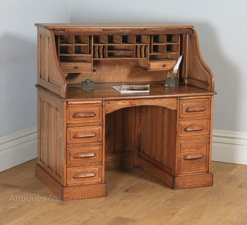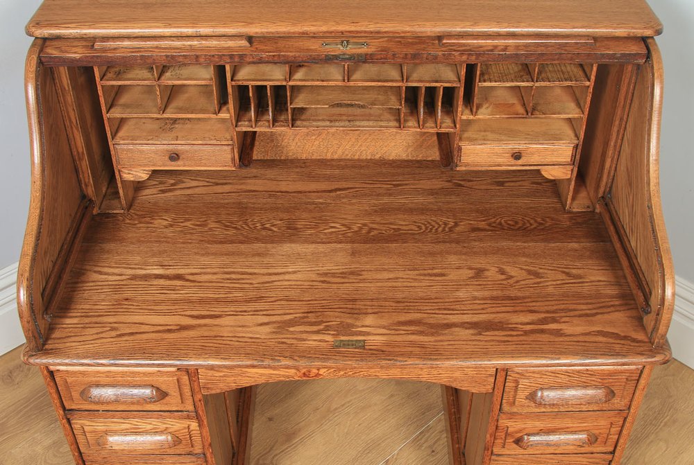 This desk is a truly classic example of a fine quality English roll top desks from the early 20th century period. The level of detail and craftsmanship displayed is high.
