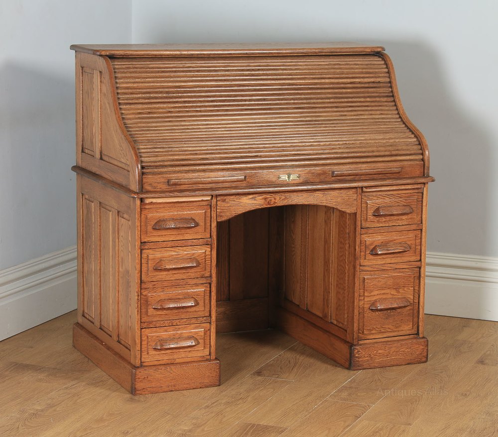 Here is a good quality antique English Edwardian oak 4ft 2” wide freestanding roll top pedestal desk, circa 1910, with a lovely golden oak colour, in excellent condition. The desk has been constructed from good quality oak and the sides of the desk features good quality pronounced fielded (bevel edged) oak panels. This desk features 4 internal drawers and 26 pigeonholes to the top section. Constructed with an “S” shaped design to the top section, the desk was designed to be freestanding in the centre of a room. The sliding tambour can be lifted up to reveal a bank of internal drawers and compartments. The internal drawers feature their original knobs and handles. Surrounding the bank of drawers are 26 pigeonhole compartments, ideal for storing paperwork, letters and other accoutrements. A letter rack is also situated either side the desk to store letters upright.