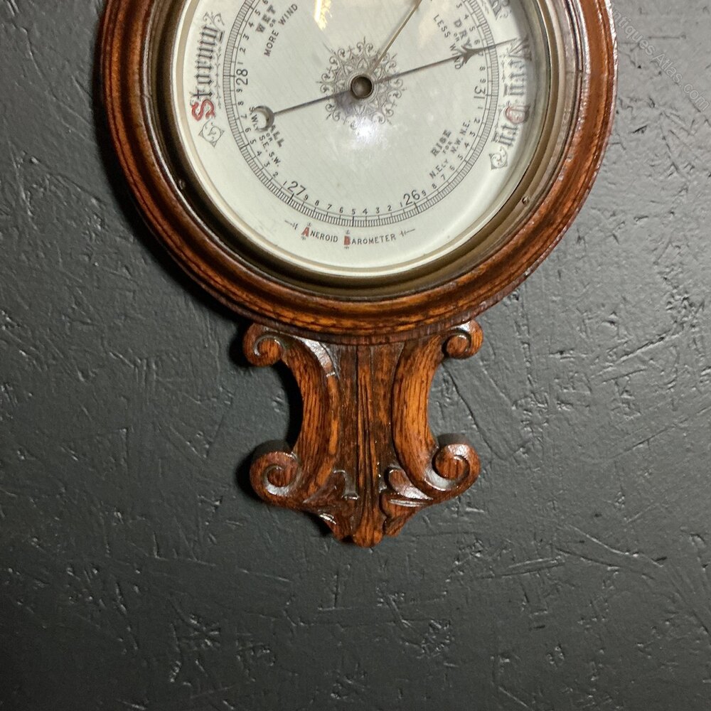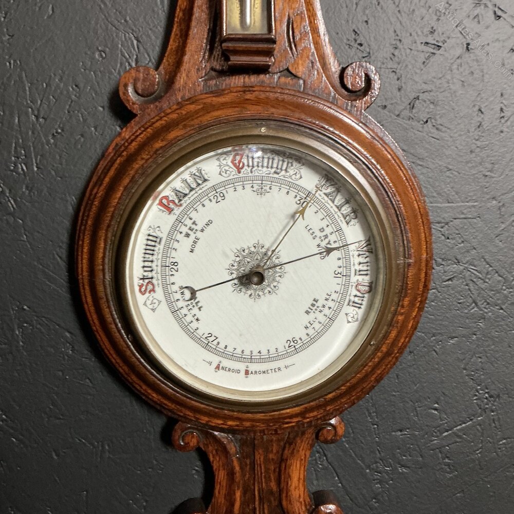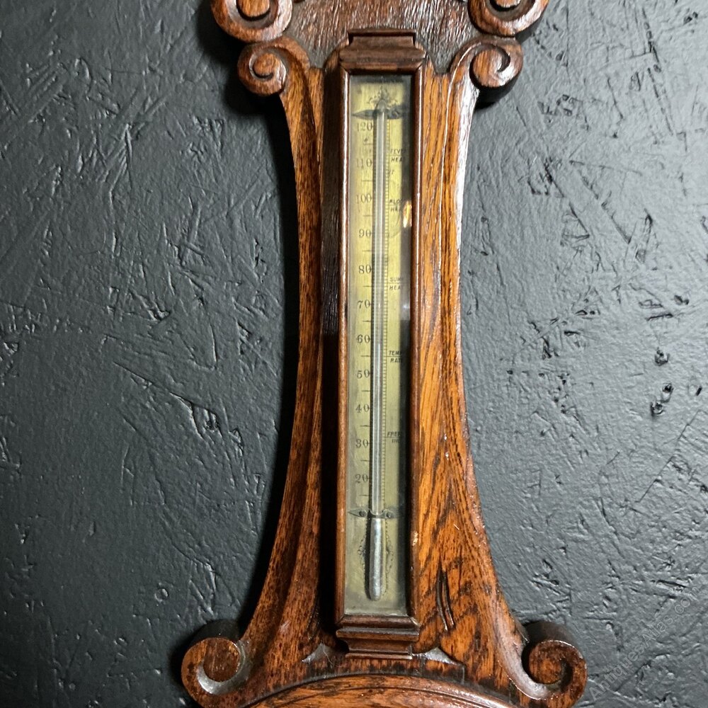 A nice Edwardian Oak barometer/thermometer, circa 1905. ‘Banjo’ in style with shapely sides and carved details. In very good condition.