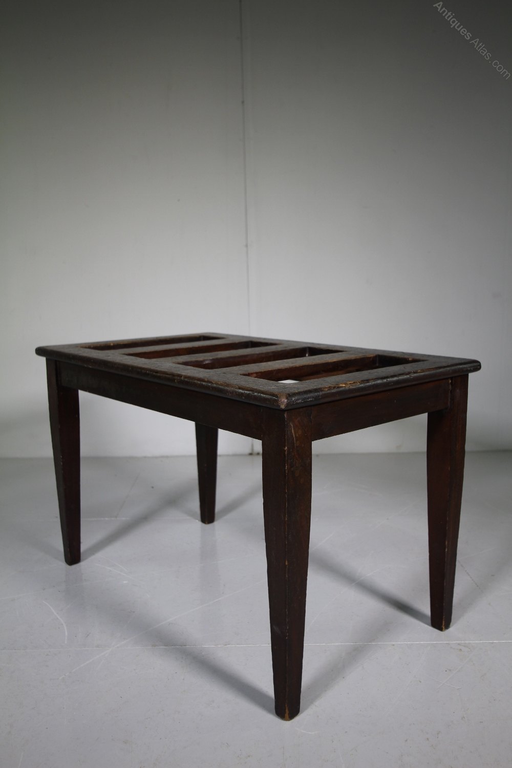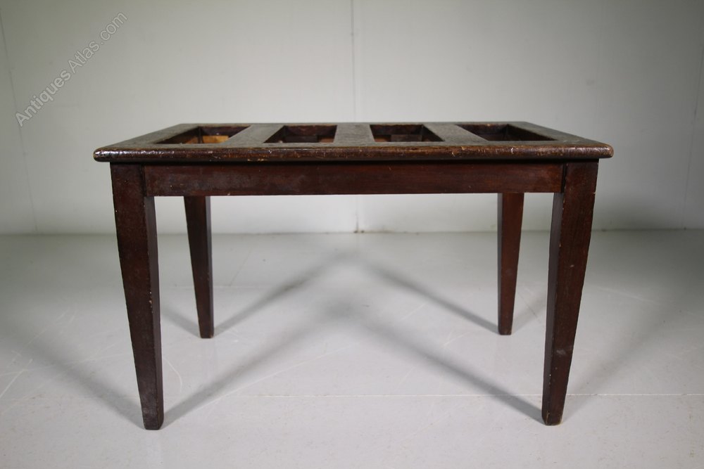 A good quality Engish antique luugage stand made and labelled by the antique furniture makers Shoolbred & Co, London around 1900. Very well made in solid mahogany, the antique luggage stand / rack has a slatted top, square tapering legs with the makers label underneath. In very good, solid and clean condition.