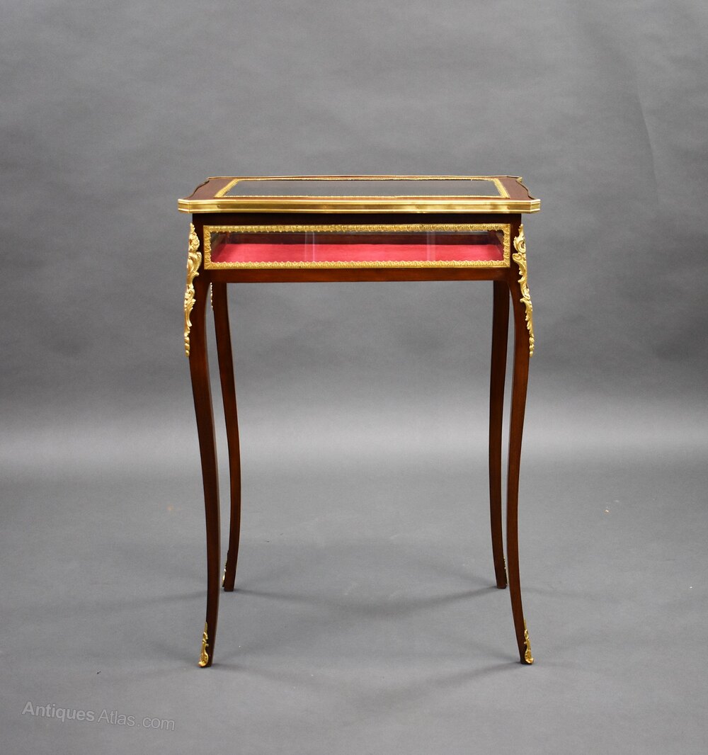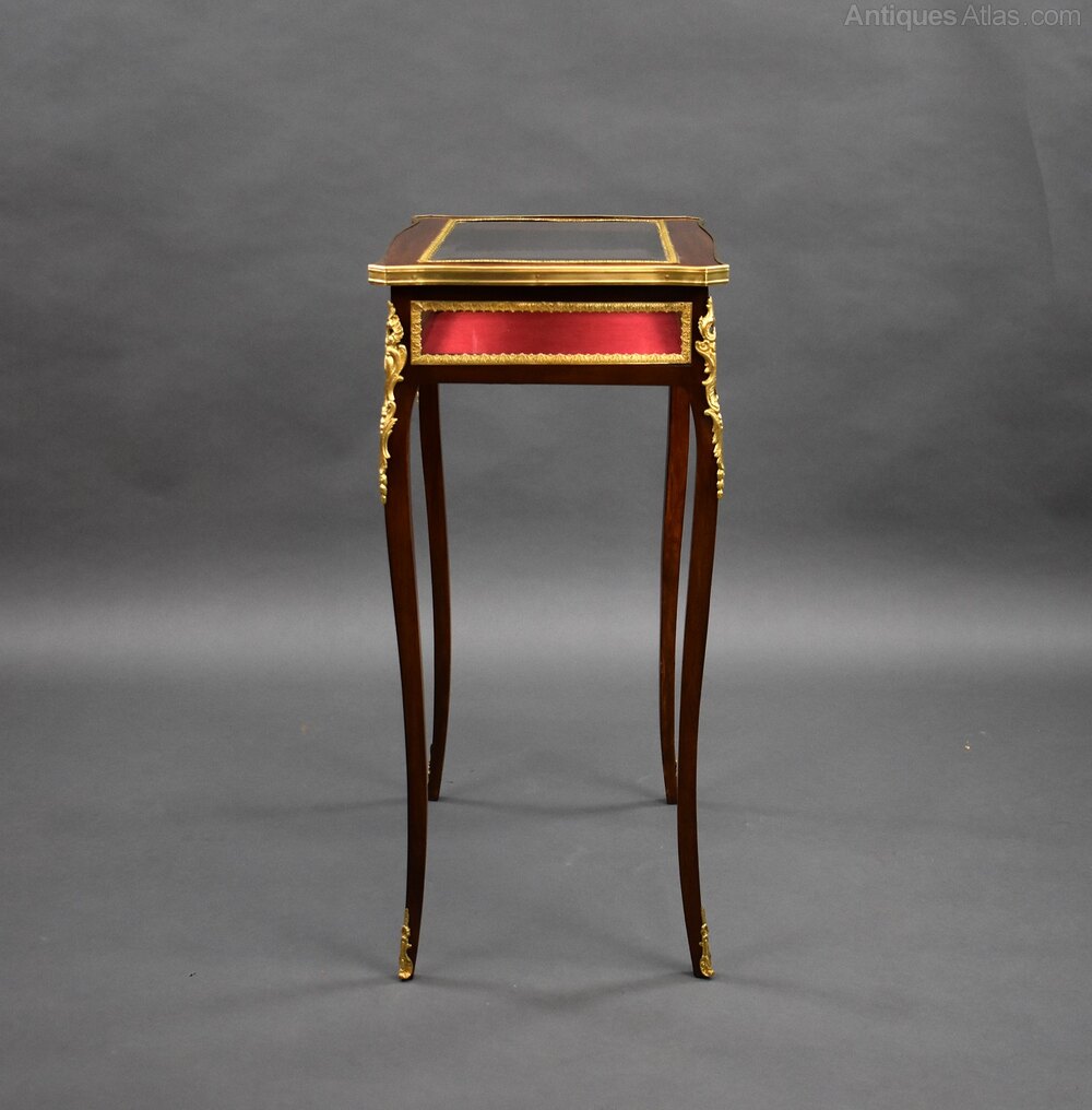 Edwardian French Mahogany Bijouterie/treasure table in good condition. The Table has bevelled glass to the top and glass to the sides with a red velvet lining. The table has ormolu mounts on each corner and each leg.