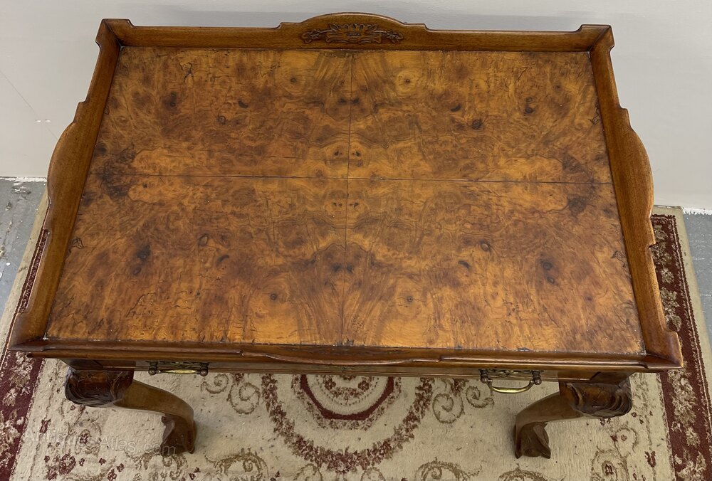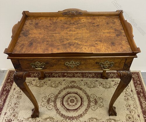 An very pretty Edwardian burr walnut silver table. This Queen Anne style table has wonderful quarter book matched veneer to the top, with scotia moulded gallery up stand with carved paterae.