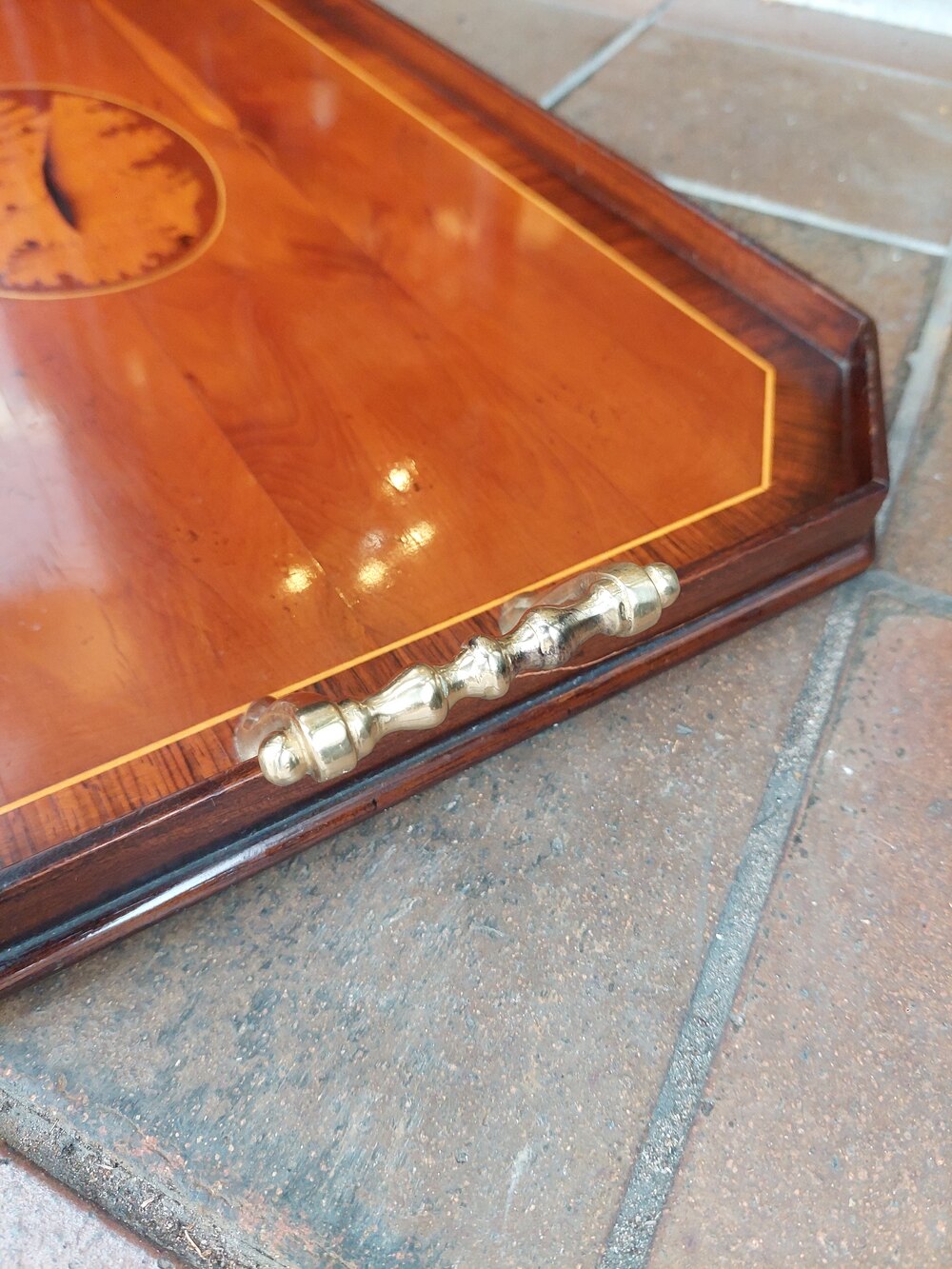 Edwardian Burr Yew, Rosewood and Mahogany Tray - with Satinwood Shell Inlay, Brass Handles and Felt Base - 24"w x 14.5"d x 2"h