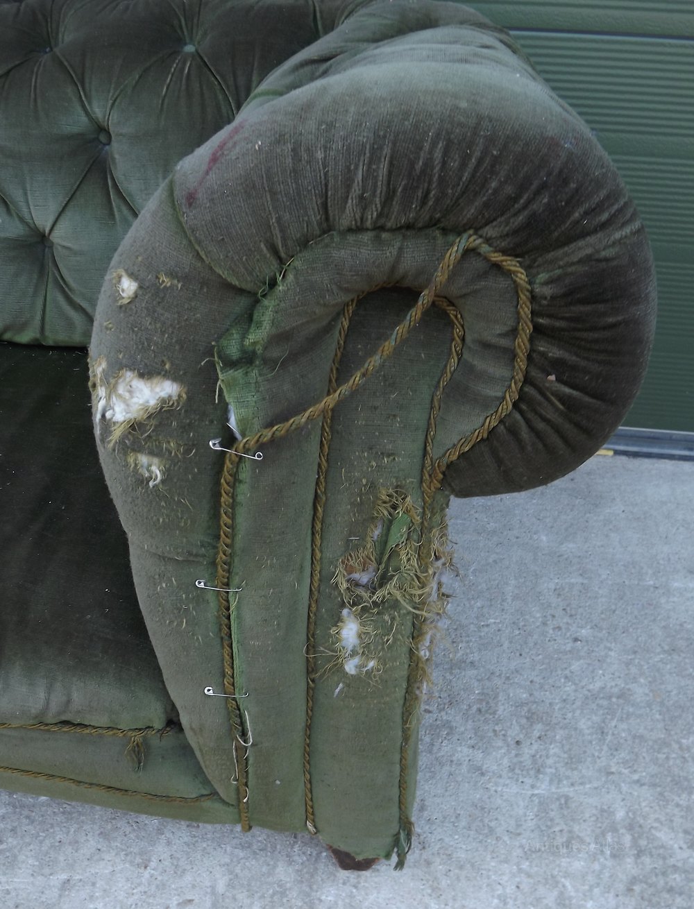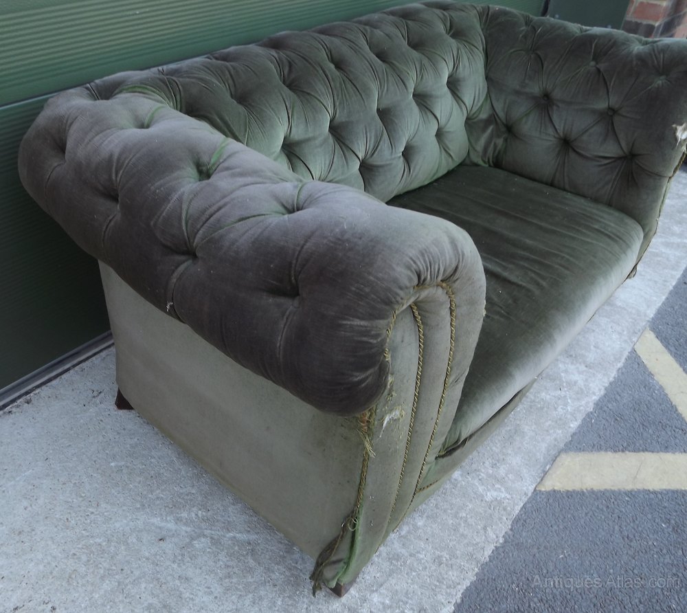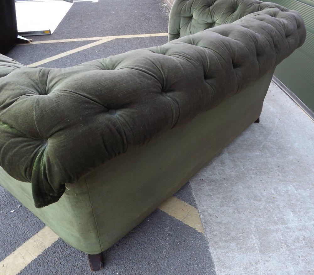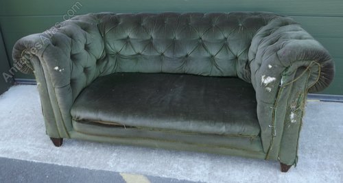 This antique chesterfield sofa dates from the turn of the twentieth century. It is sold as seen, in need of complete restoration and re-upholstery. It has scrolled arms and a button back. It is supported on wooden legs. The upholstery is not original.