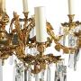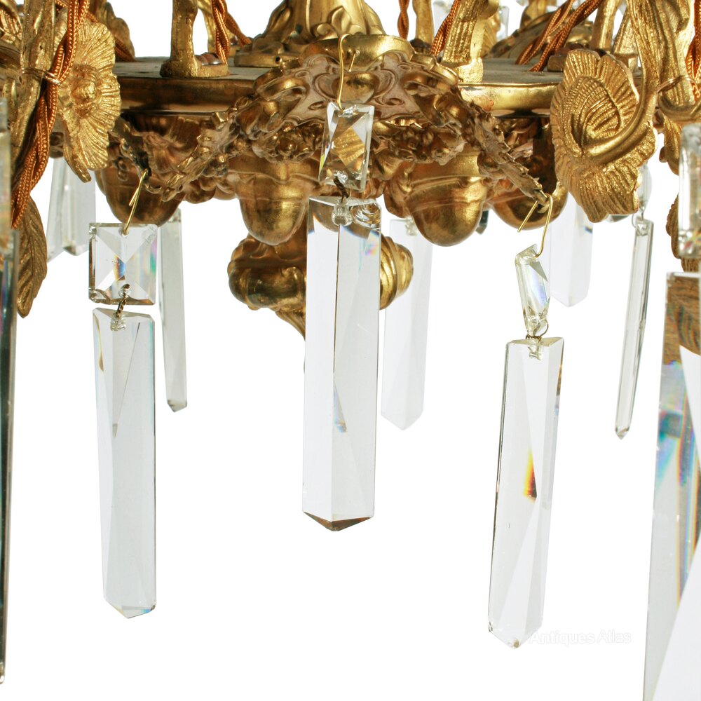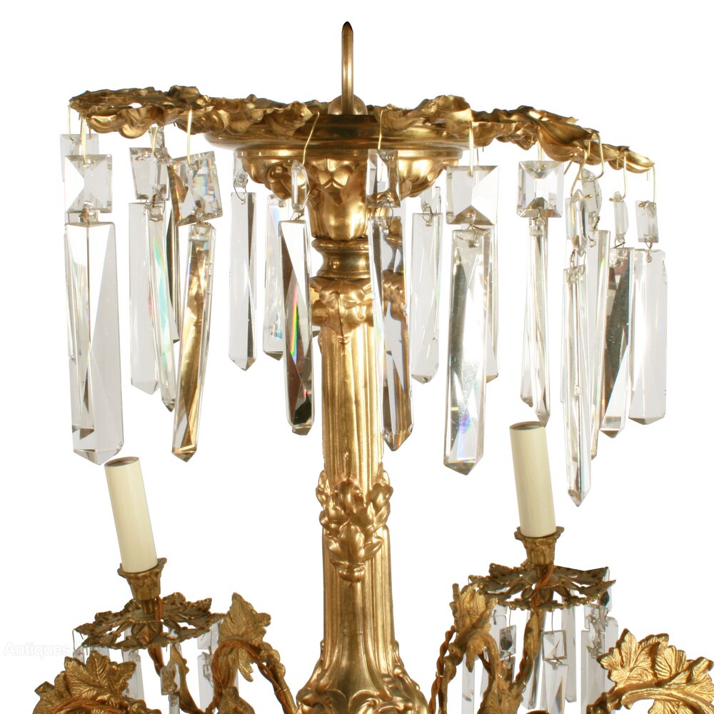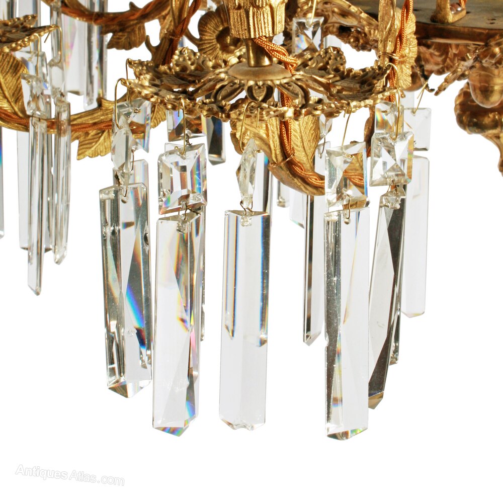 The top and underside of the chandelier have pressed embossed shaped gilt metal panels, these and the drip trays are decorated with hanging cut crystal prisms, in excess of 130 prisms in total.
