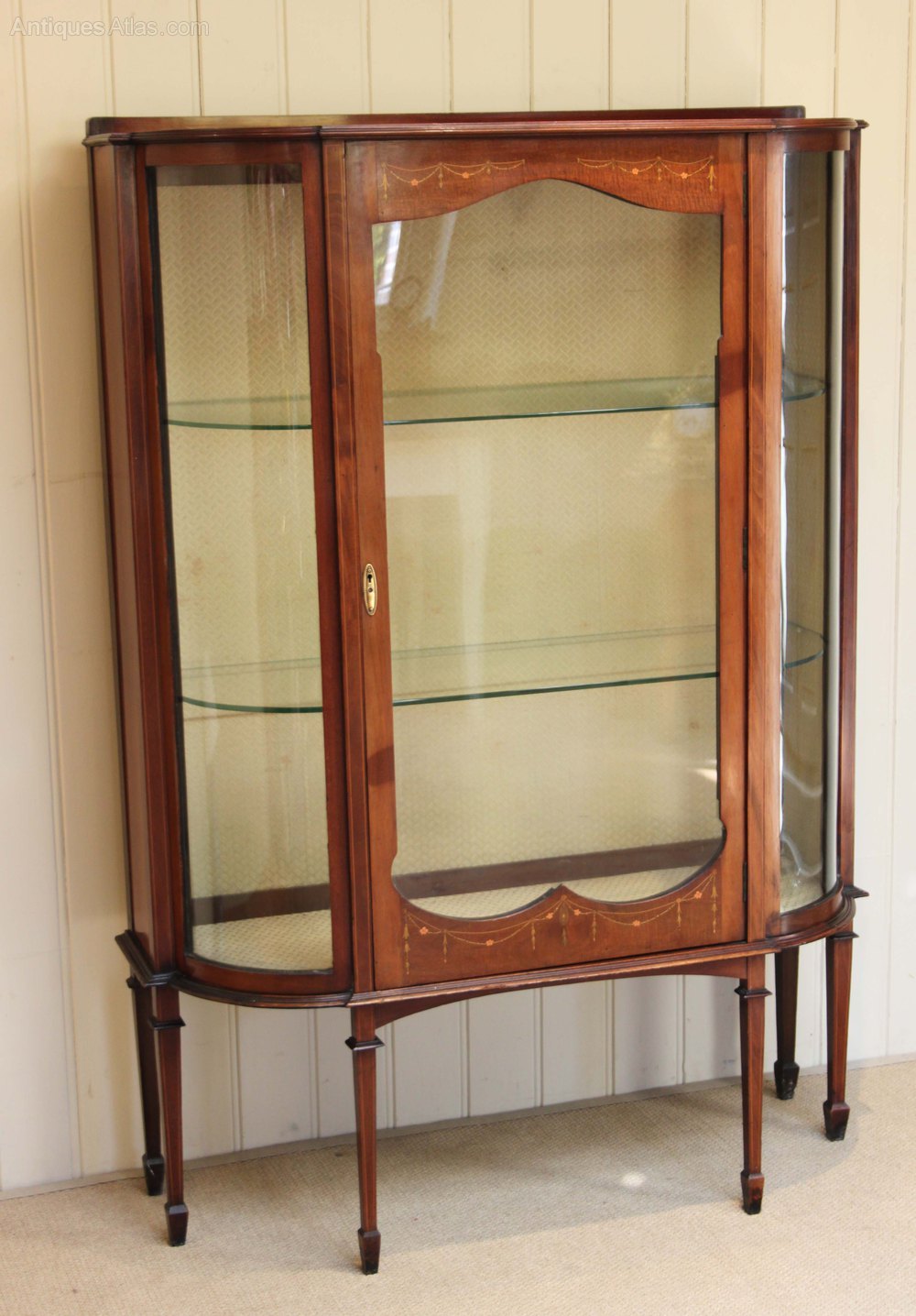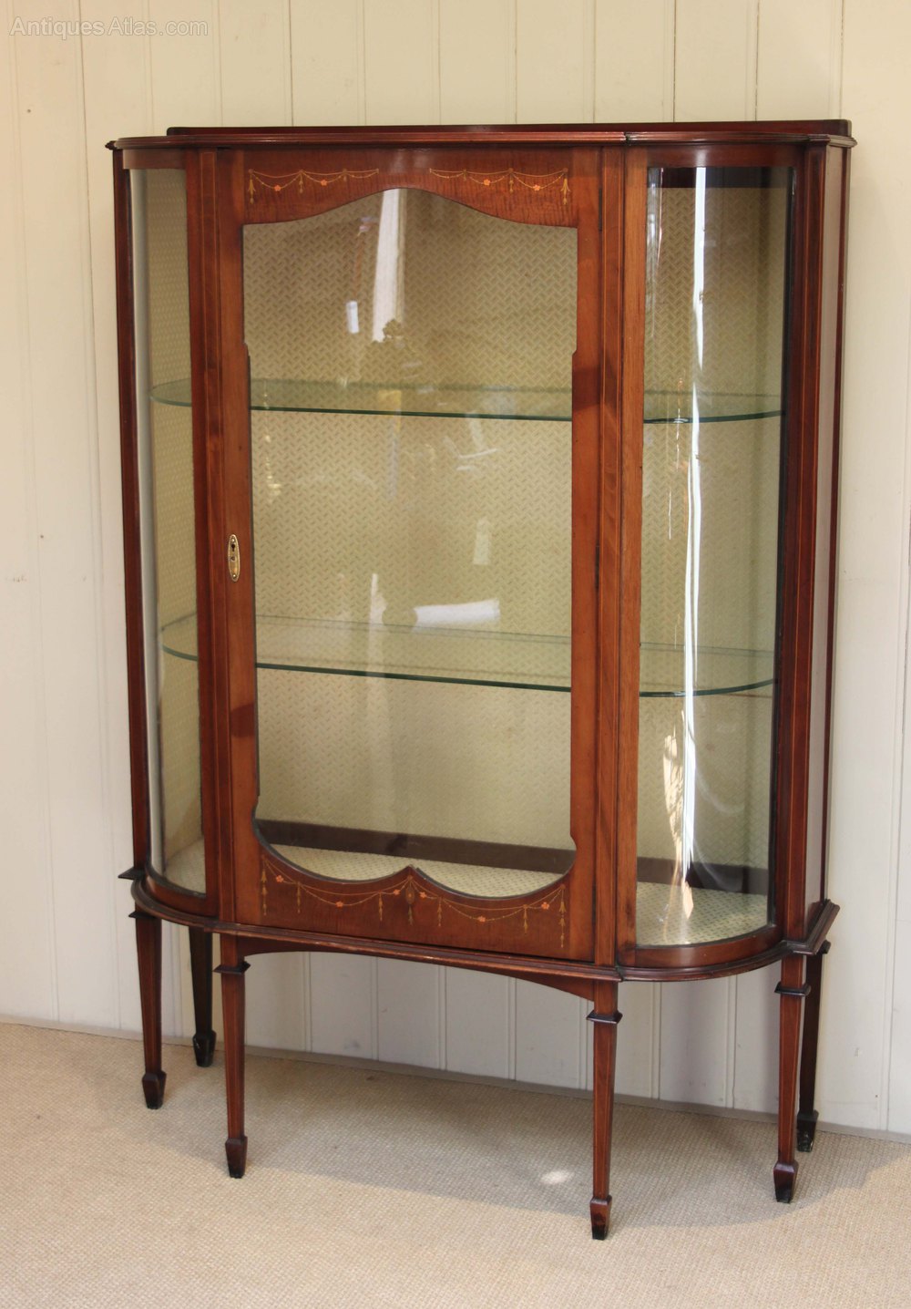 Edwardian inlaid mahogany display cabinet having a central door flanked by two bowed glass sides,inlaid with floral swags and raised on tapering supports with spade feet.With two internal glass shelves