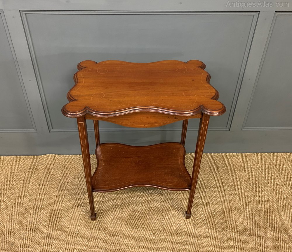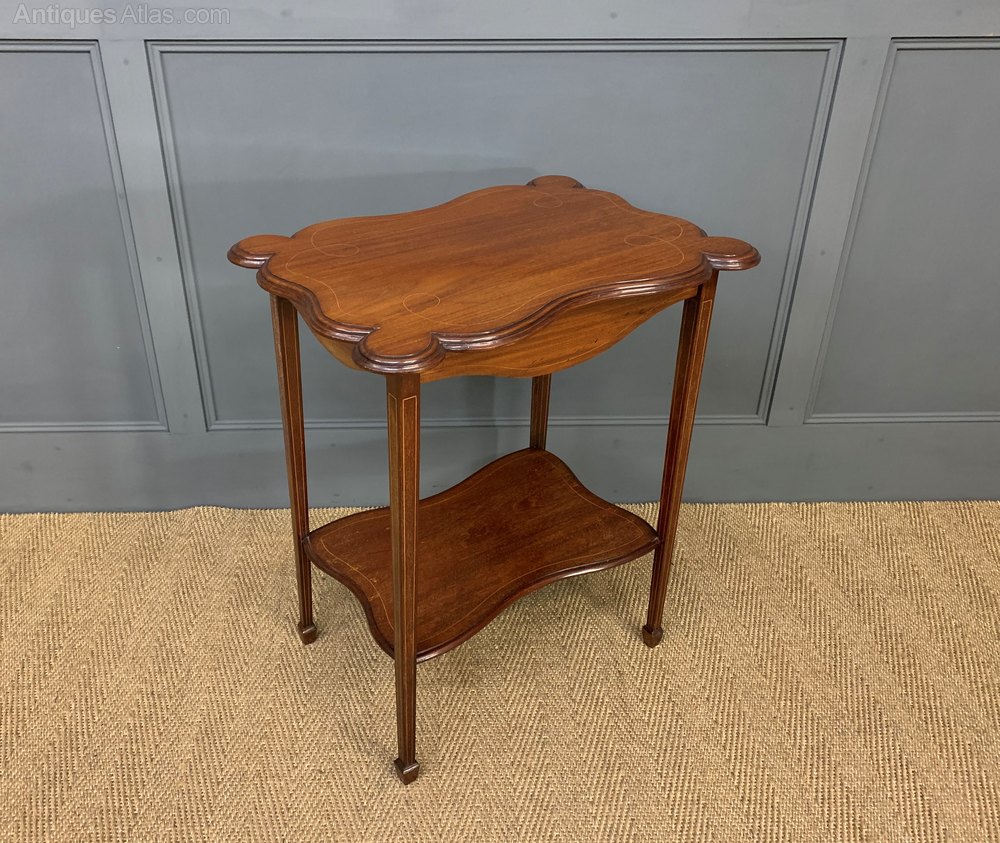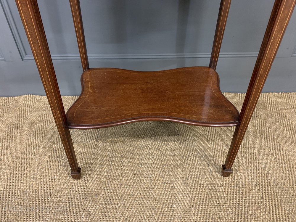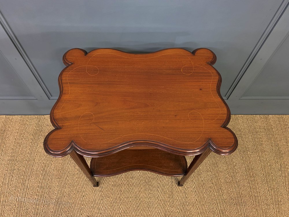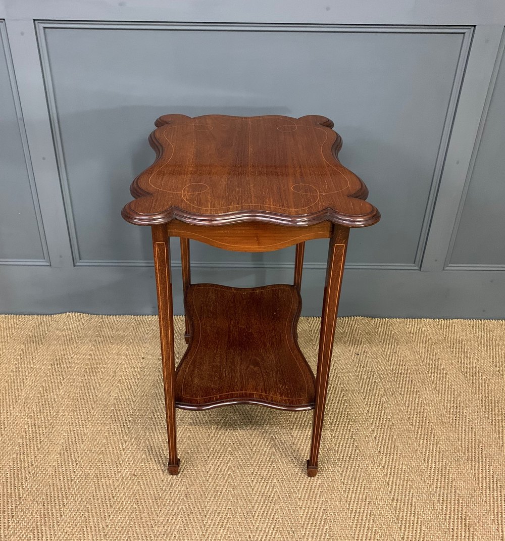 A pretty Edwardian period inlaid mahogany occasional table. The lobbed top is decorated with inlaid stringing in boxwood, this continues to the freeze, legs and under-tier. The square tapering legs terminate in spade feet and are united by an under-tier. Cleaned and waxed in our workshops and now offered for sale in very good original condition, ready to go straight into the home.