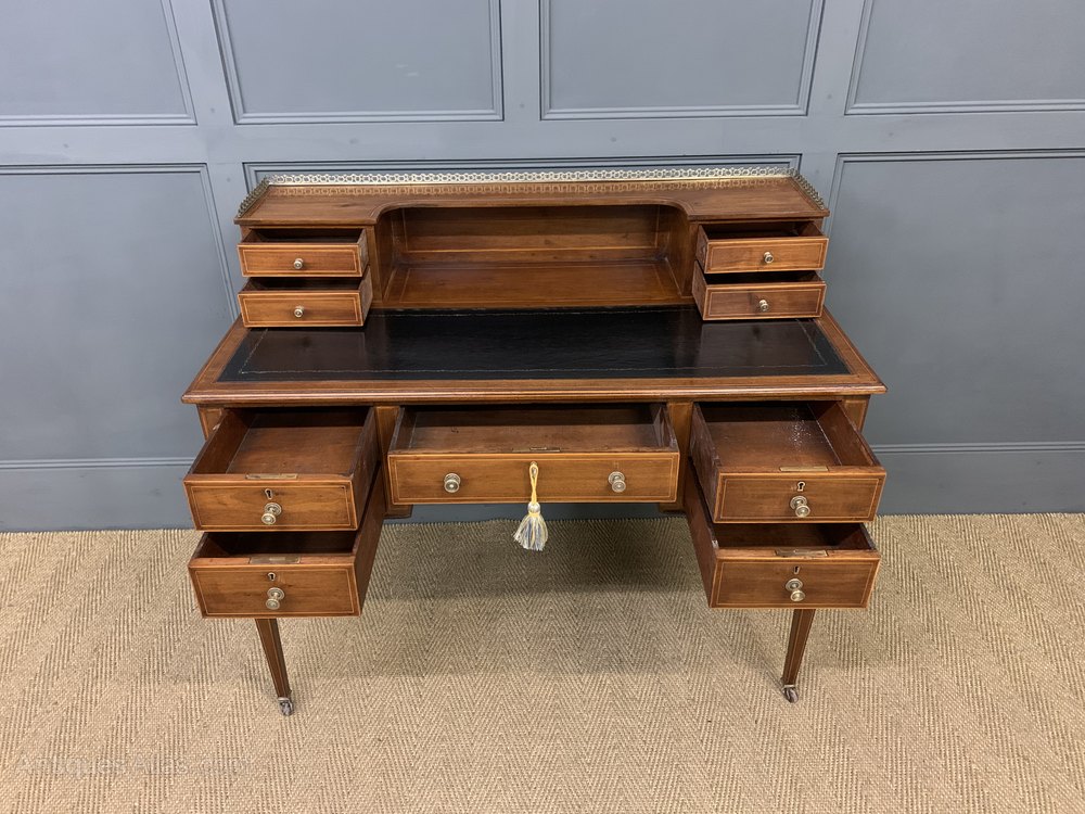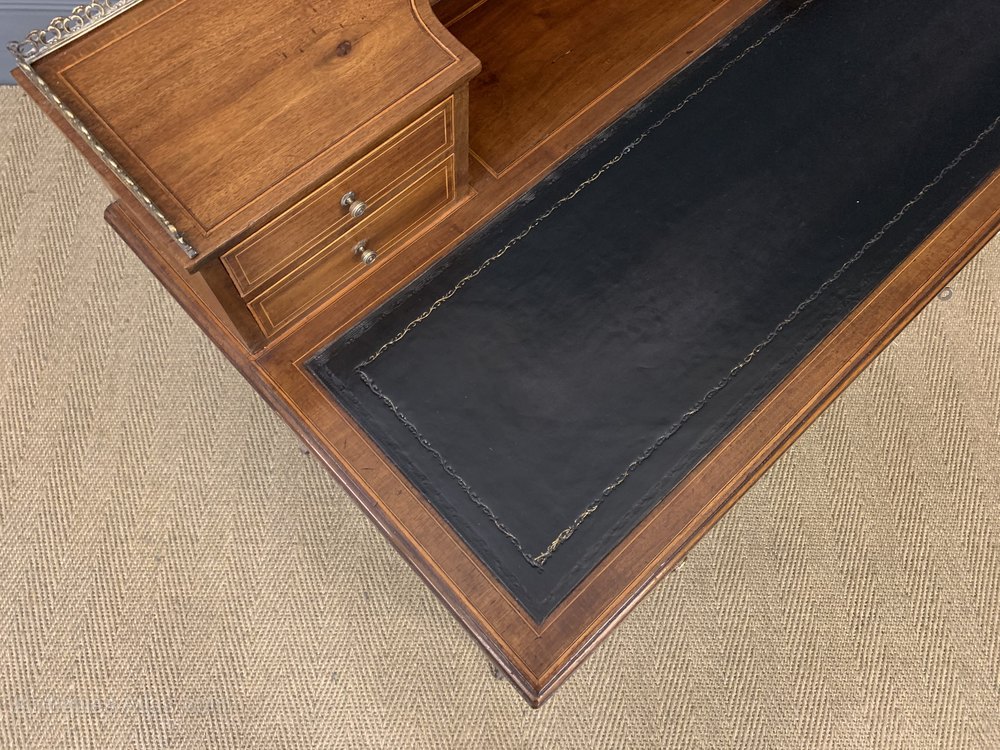 A very good Edwardian period inlaid mahogany writing desk, or table. Well constructed in solid mahogany with attractive mahogany veneers and embellished with inlaid stringing throughout. The superstructure with 2 pairs of short stationary drawers and surmounted with a crisply cast brass gallery. The main body of the table is fitted with a sumptuous black leather writing surface complete with gilt tooled decorations to the surrounds. With a series of 2 pairs of short drawers flanking a longer central drawer. The central drawer is lockable (key supplied) and all drawers are fitted with their original solid brass handles. All standing on long , elegant, tapering legs which terminate in their original brass and brown ceramic castors. Sympathetically refinished in our workshops and now offered for sale in excellent condition, ready to go straight into the home or office.
