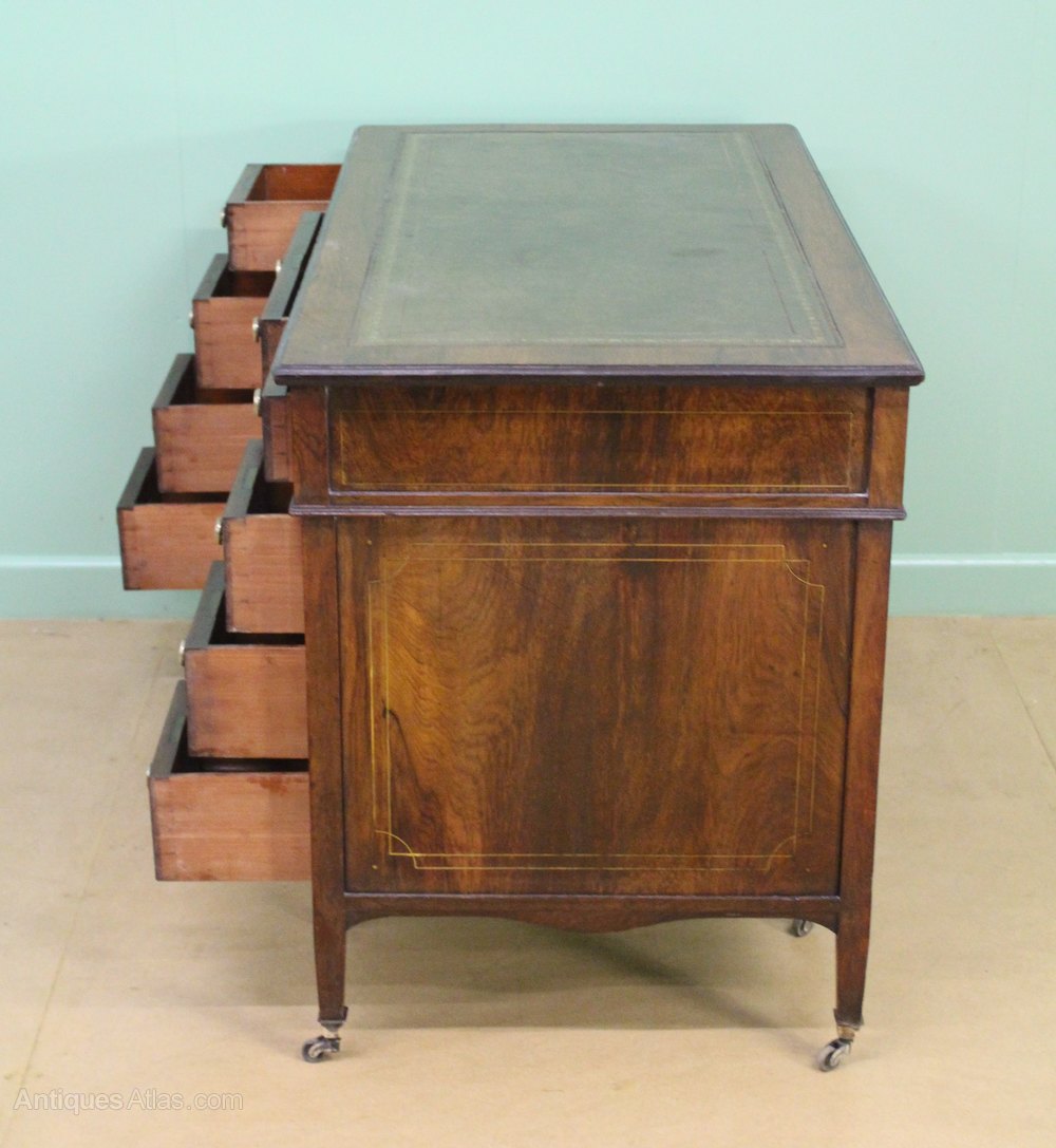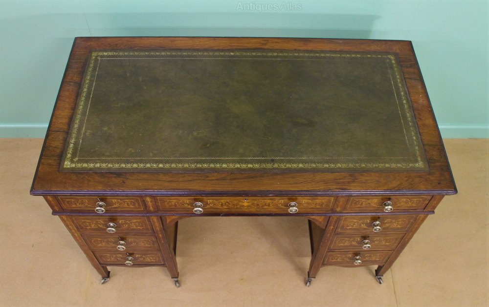 An attractive Edwardian period inlaid rosewood writing desk. The top is fitted with a sumptuous leather writing surface, highlighted with gilt tooled detailing. Of good construction in solid rosewood with stunning rosewood veneers onto a mahogany carcas. Embellished with inlaid floral detailing and harebells and further inlaid stringing throughout. There is an arrangement of 2 banks of 4 graduated drawers flanking a central long drawer. All drawers are fitted with their original solid brass handles. Standing on short tapering legs which terminate in their original solid brass castors. This stylish desk is offered for sale in excellent condition, ready to go straight into the home office.