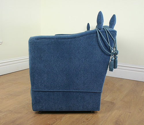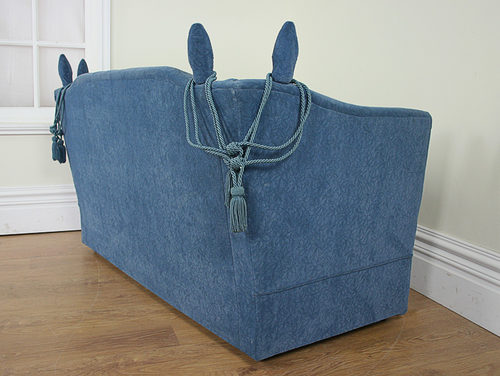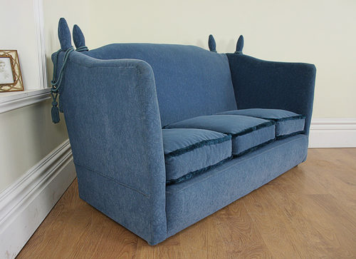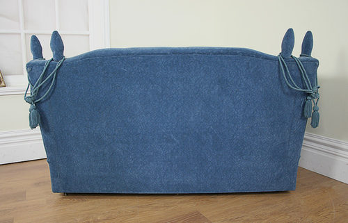 This is a very good quality antique English Edwardian upholstered Knole style arm couch, circa 1901 – 1910. The couch is upholstered in a blue floral pattern material. The arms of the knole style couch are fixed. The upholstered finials in both corners have tassel tie backs that secure the couch sides and a tassel fringe below. There are three feather cushions. The couch sits on castors and will seat 2 – 3 persons.
