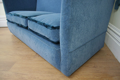 The fabric is clean and shows no signs of wear or damage. The arms of the couch are fixed but could be made to be separated if the couch was re-upholstered. The frame of the couch is solid in joint. The couch features replacement castors.