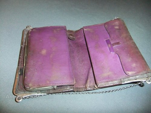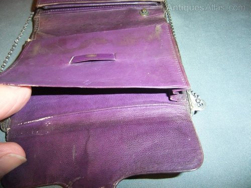 There are several pockets, including one for notes and a section for coins held with a metal catch. This catch has become detached on one side side but it is still functioning. Please see photos. Also one with a folding cover.