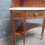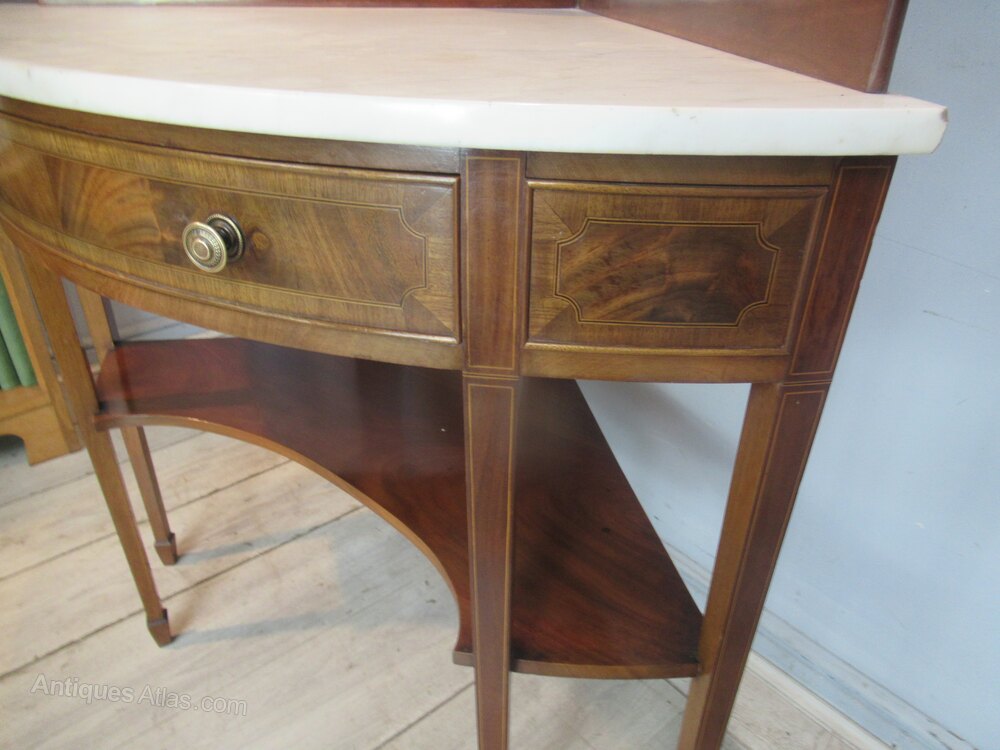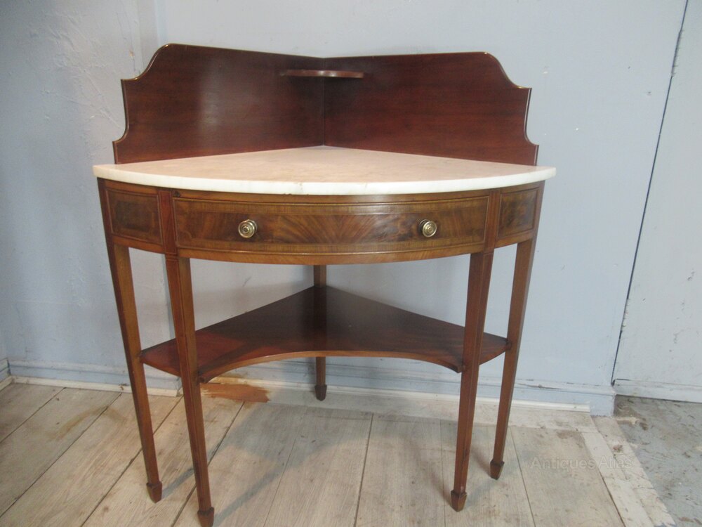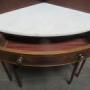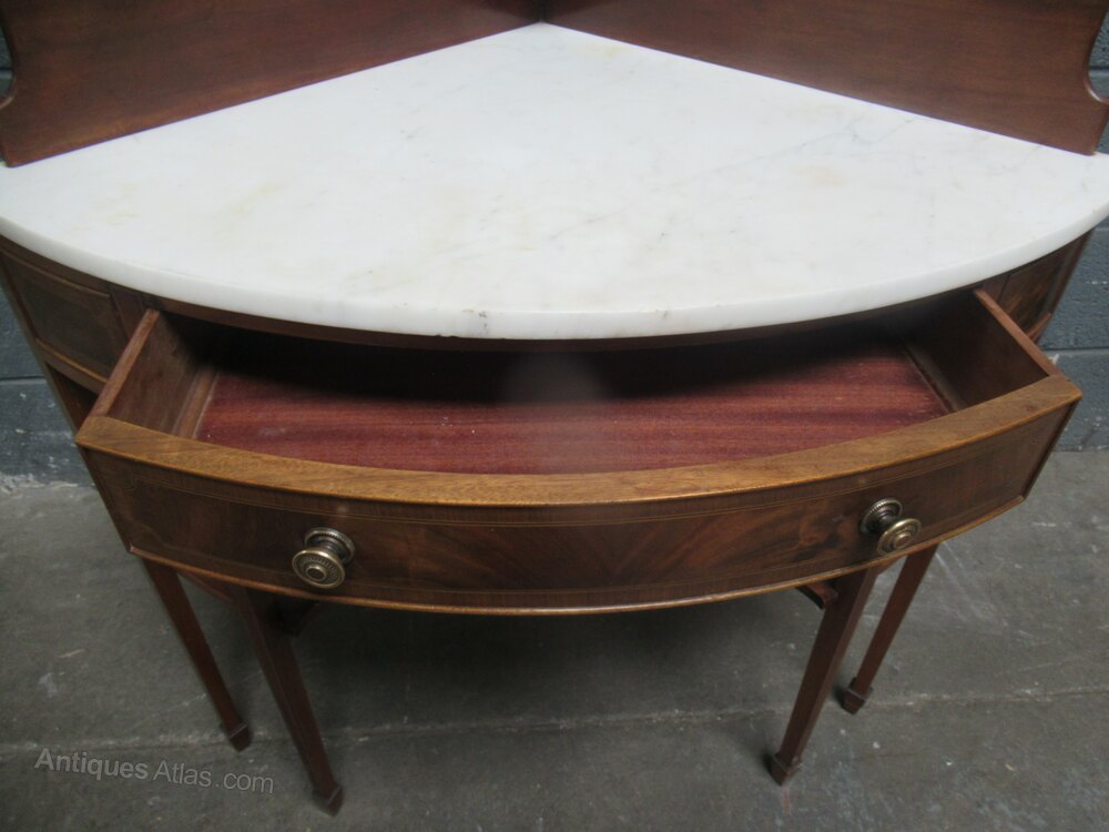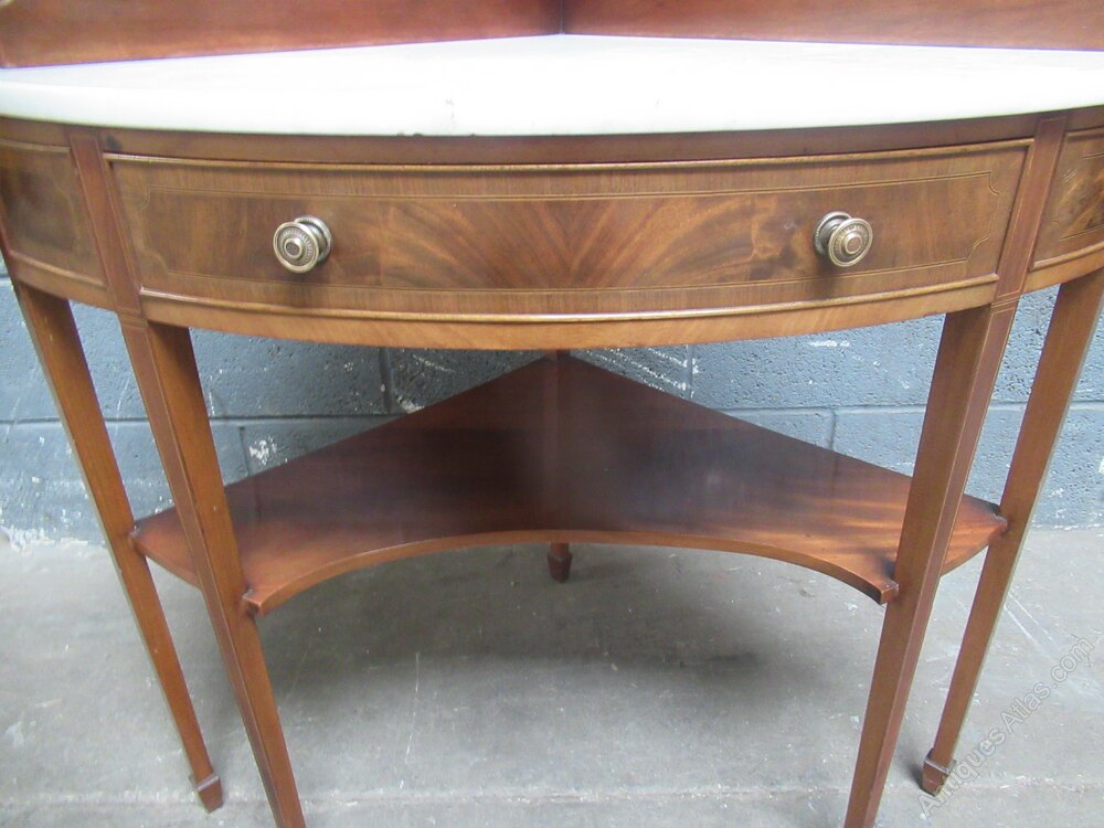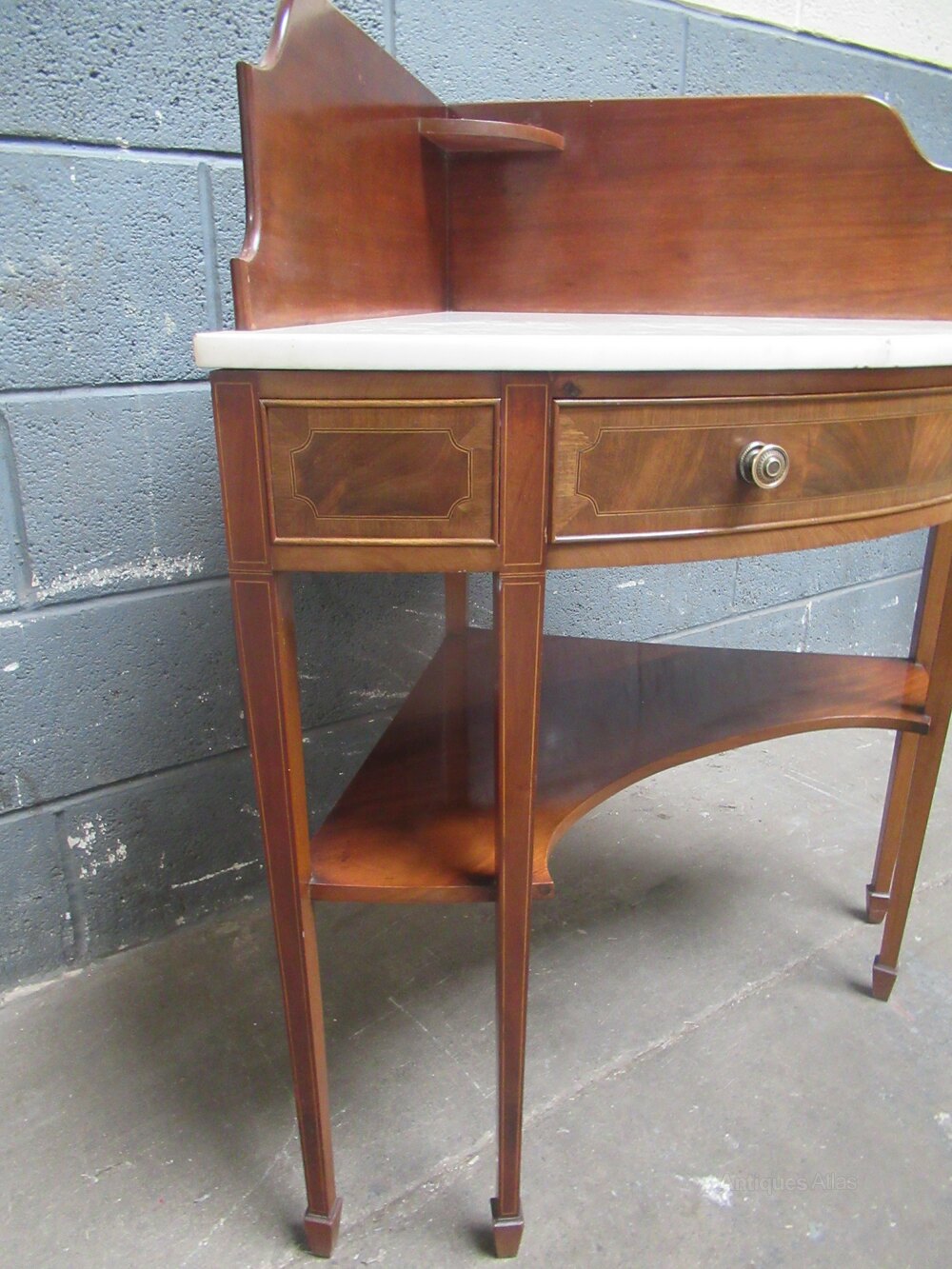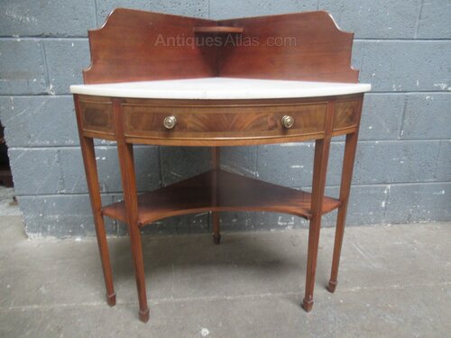 Edwardian mahogany corner wash stand dating from around 1910. With a white marble top, tall rear sides, and with a bow front drawer with brass handles. The washstand has double taper legs to each side , a lower platform shelf with line inlay.
