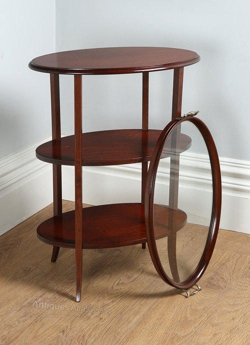 The glass tray sits on a rebated base so that it does not slide off the top off the table. The glass tray features a glass base with a splayed galley and elegant brass carrying handles either side. The outside perimeter of the tray is elegantly decorated with satinwood inlay in a chequer format. The table consists of three shelves in total and is supported by four refined splayed legs. Further satinwood inlay stringing is incorporated into the shelves and legs. This table is a truly classic design inspired by the Regency period a style of which was prominent and fashionable, and a style that was incorporated in antique furniture made throughout the Edwardian period. All in all, this is a very pretty and superb quality unusual table, which is in excellent condition.