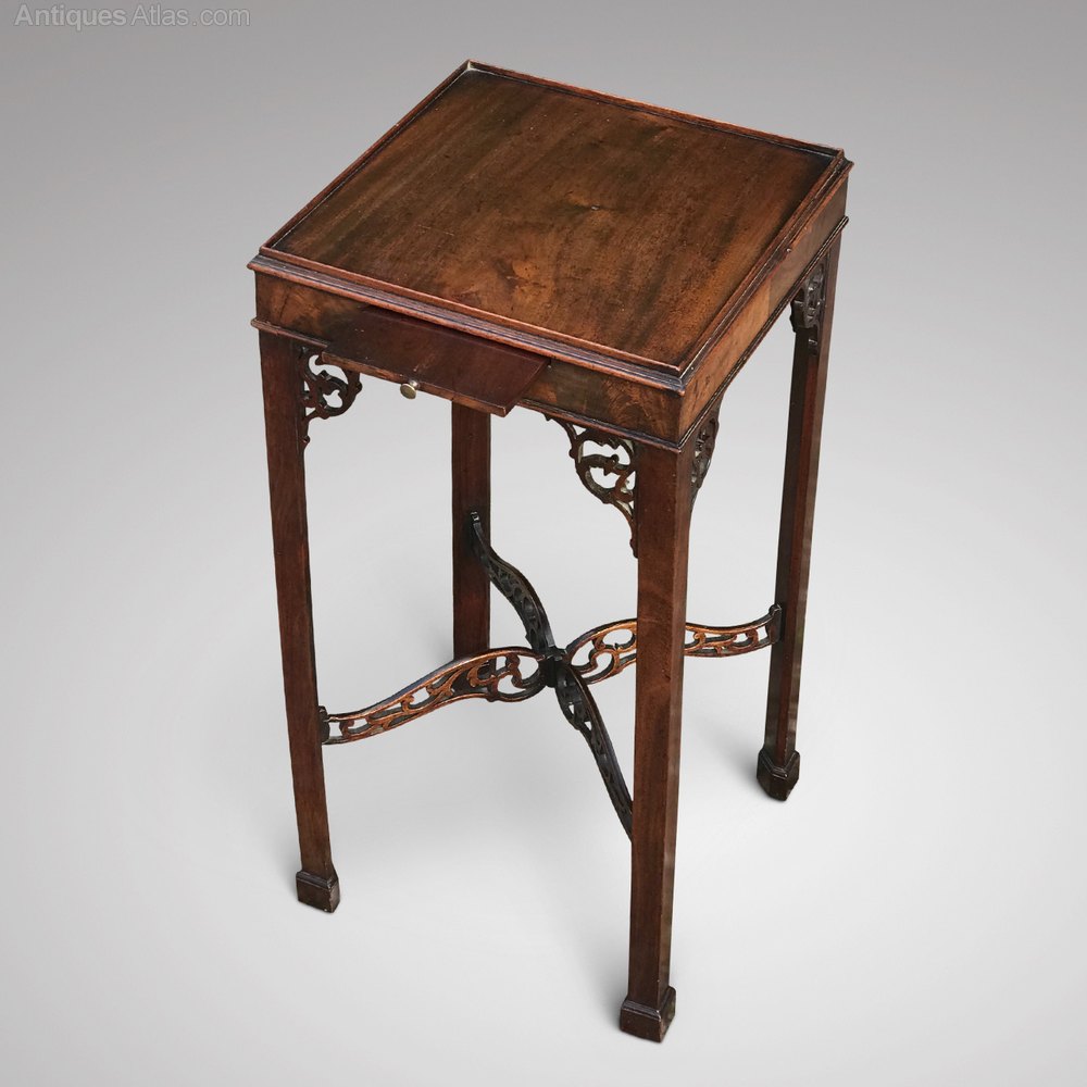 A super Edwardian mahogany kettle stand or lamp table in the early Georgian style. This charming table has a sliding cup tray, pierced corner brackets, pierced cross stretchers and is raised on four chamfered legs.