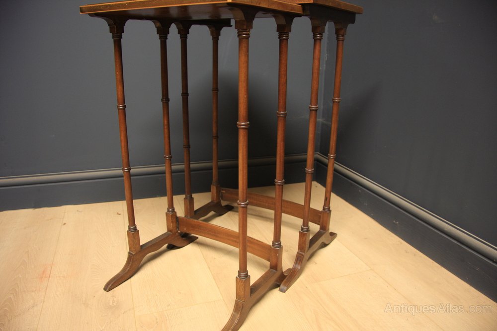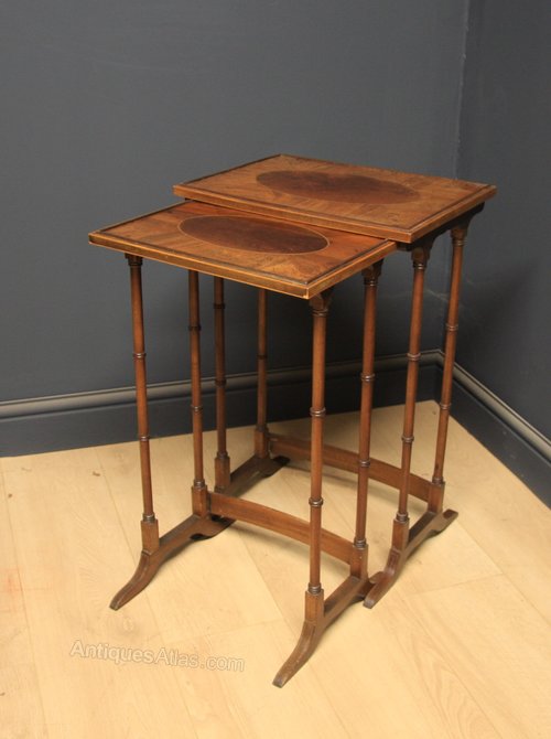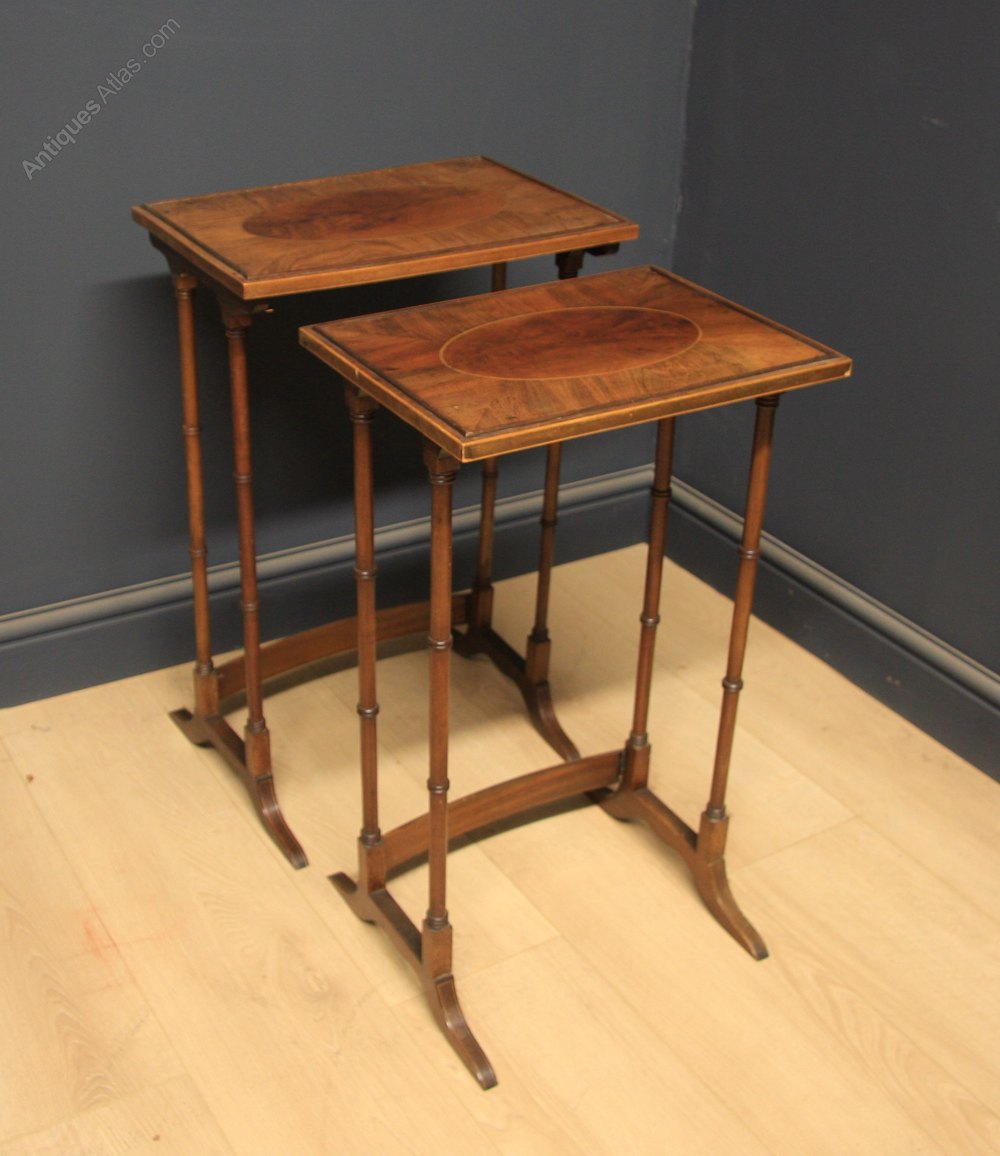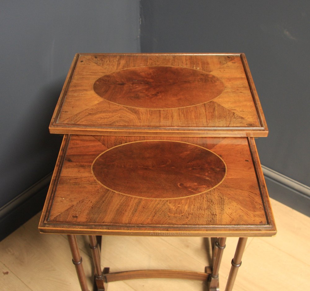 Nice quality Edwardian mahogany nest of 2 antique tables having rectangular top with oval flamed mahogany centre surrounded by crossbanding and inlaid all standing on fine turned legs and small outswept feet.