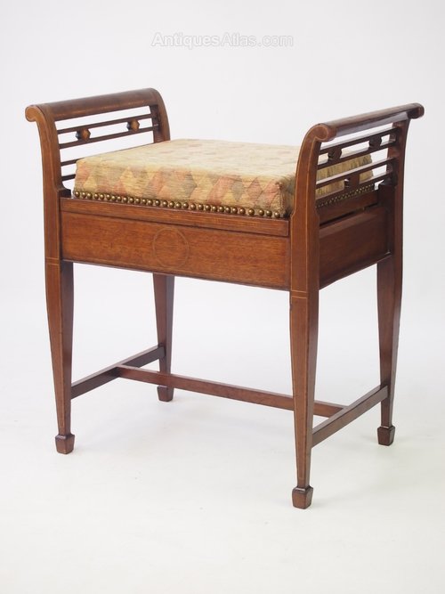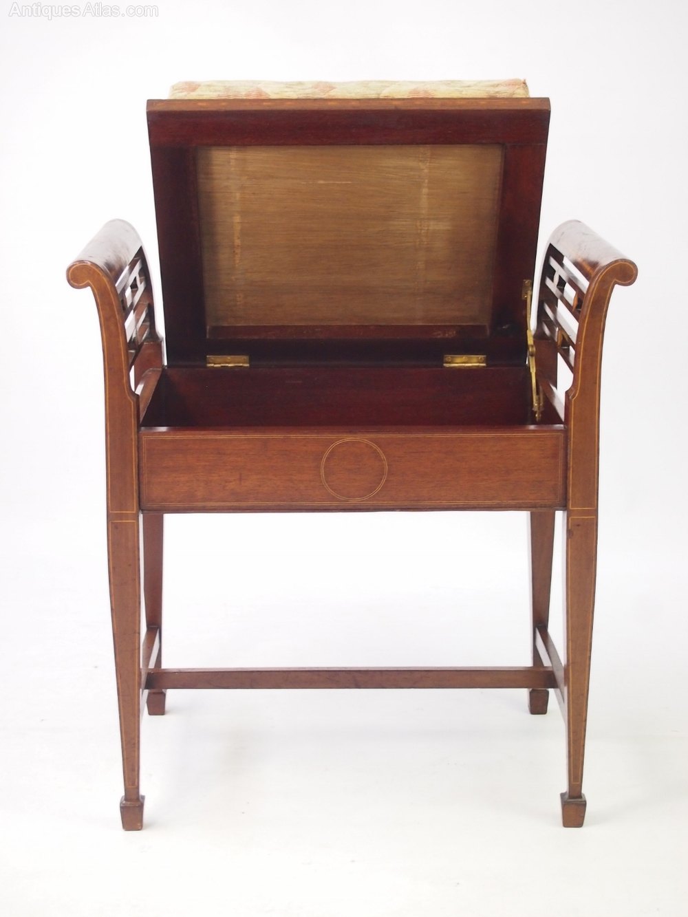 A good quality antique Edwardian mahogany and inlaid piano stool dating from circa 1910. It has a lift up lid revealing storage and shaped carry handles. It stands on square tapered legs united by cross stretchers. The upholstery appears fairly new and clean.
