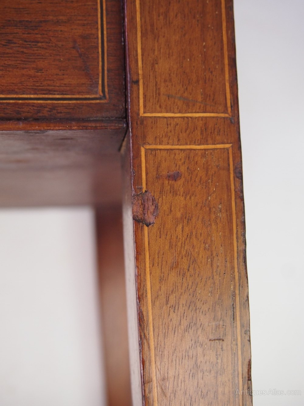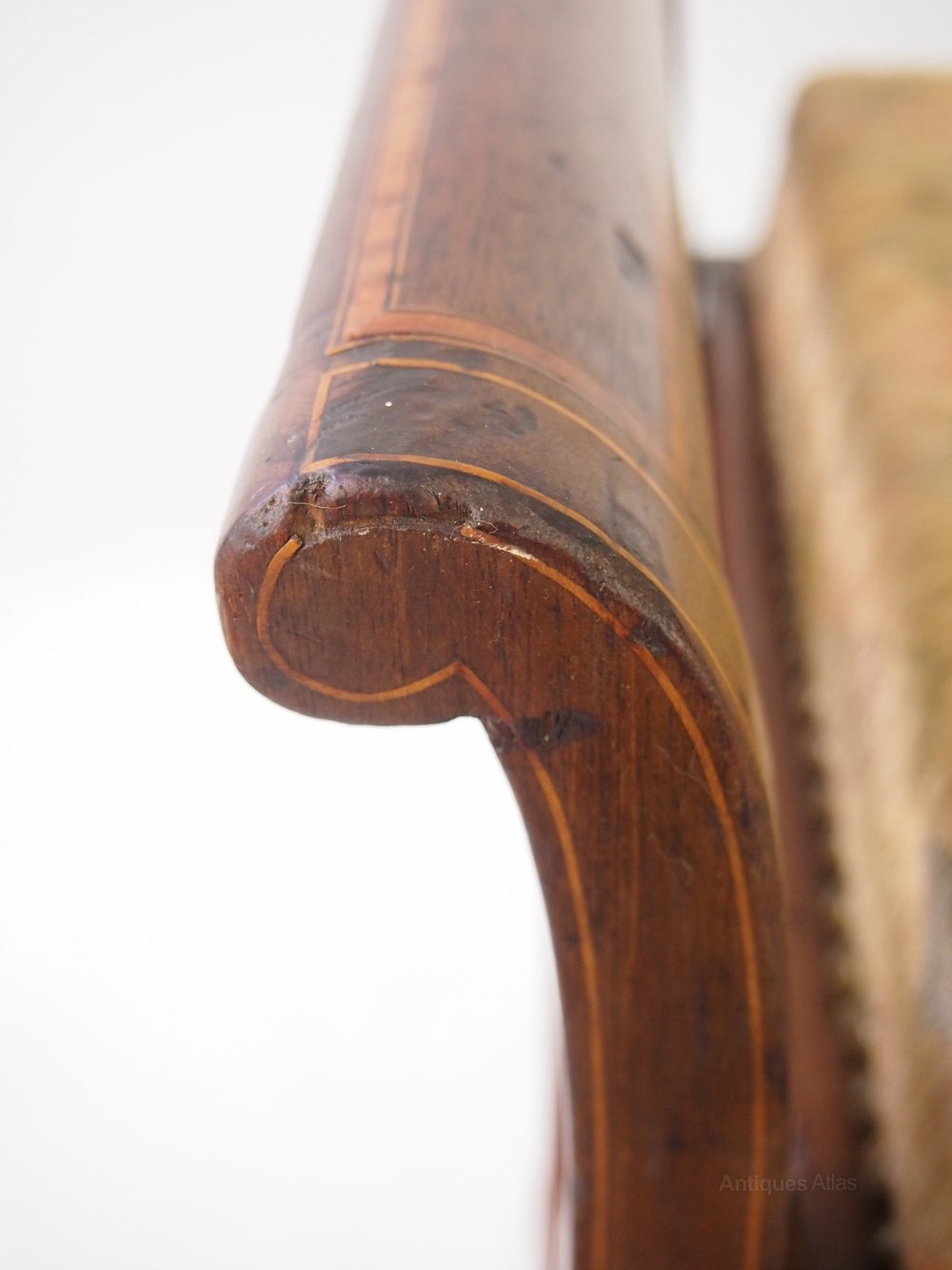 Some stringing and inlay missing near front of handles (see picture). Slight give to frame (but not wobbly). Other general wear commensurate with age. The upholstery appears fairly new and clean.