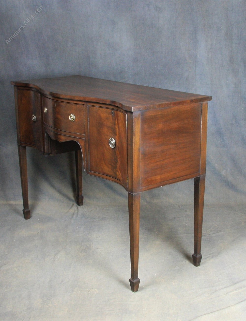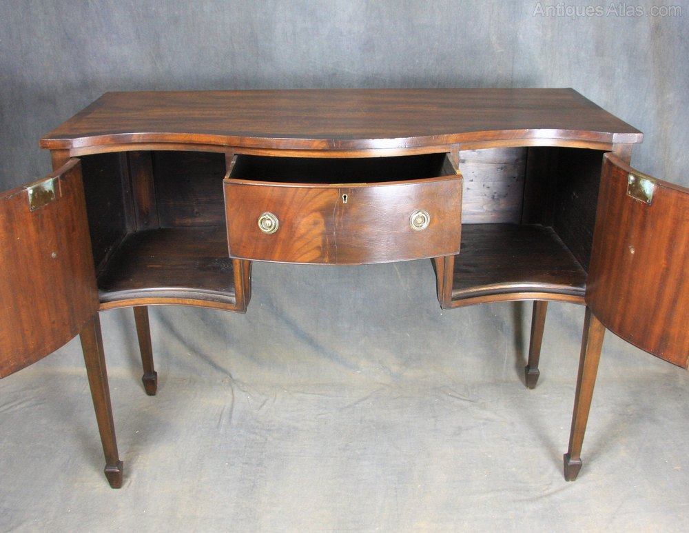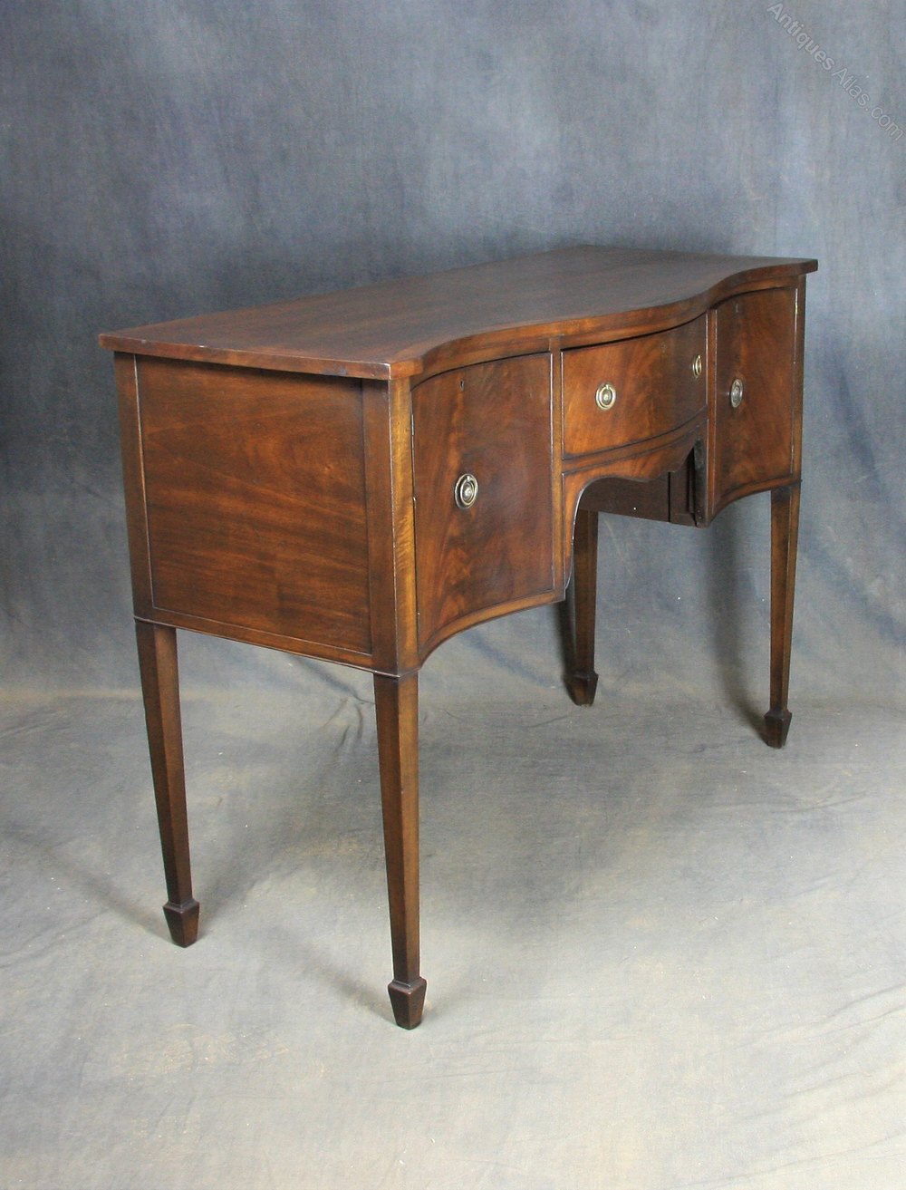 Lovely Edwardian mahogany serpentine sideboard having cross banded top over single drawer with circular brass handles flanked either side by single cupboards with circular brass handles all standing on square tapering legs finishing on spade feet.