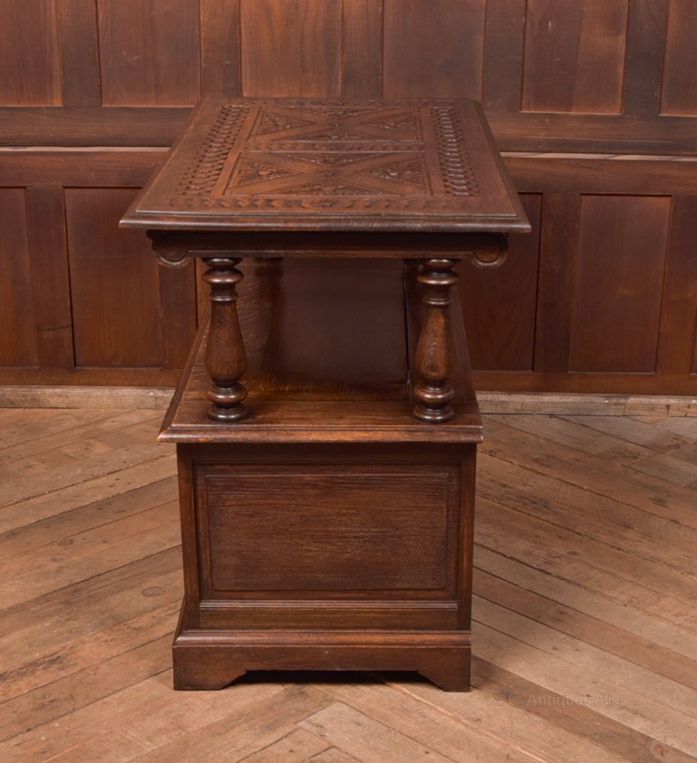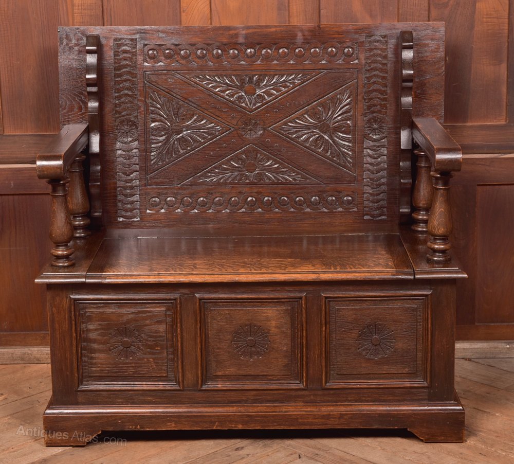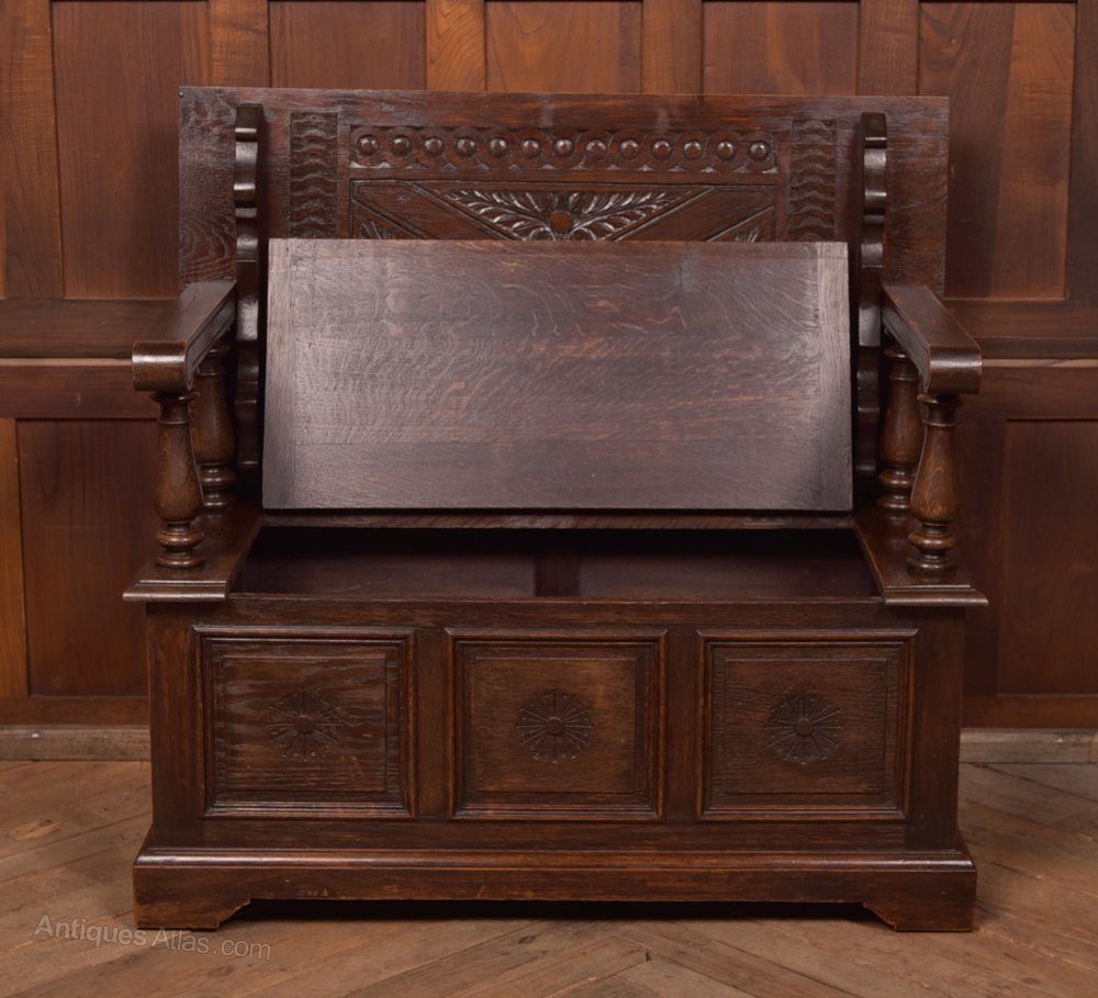 Wonderful Edwardian monk bench/ hall seat/ settle made in solid oak. The attractively carved back rest lifts and folds down to transform the bench into a very useful table. The carved table top rests on oak arms supported by beautifully turned balusters. The panelled seat with carving to the front three, lifts to provide ample storage for boots, shoes, bags etc. This outstanding oak bench is a very practical useful piece of antique furniture with superb colouring, beautiful graining and wonderful patina.
