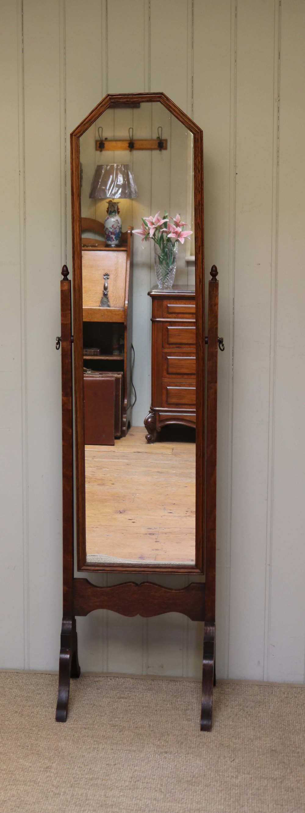 Edwardian oak framed cheval mirror having canted corners with scroll legs united by a shaped support and turned wooden finials