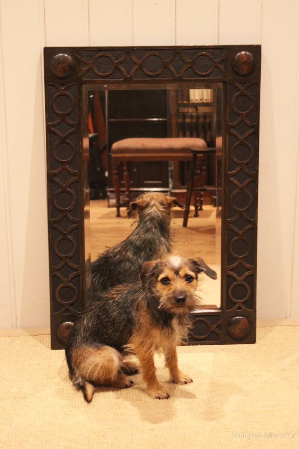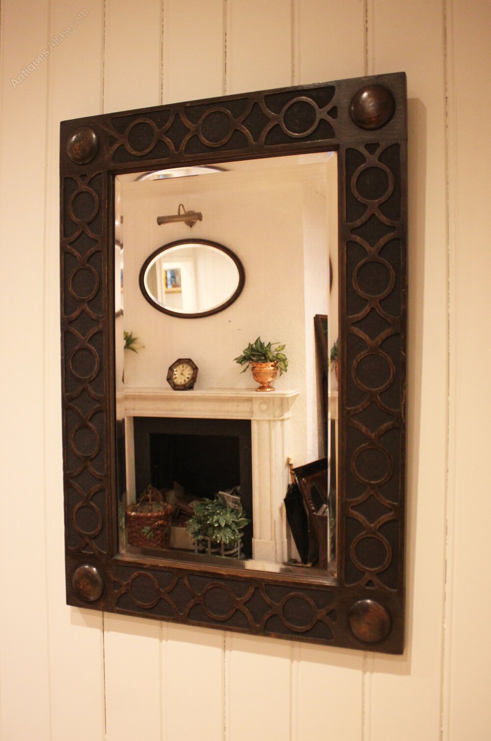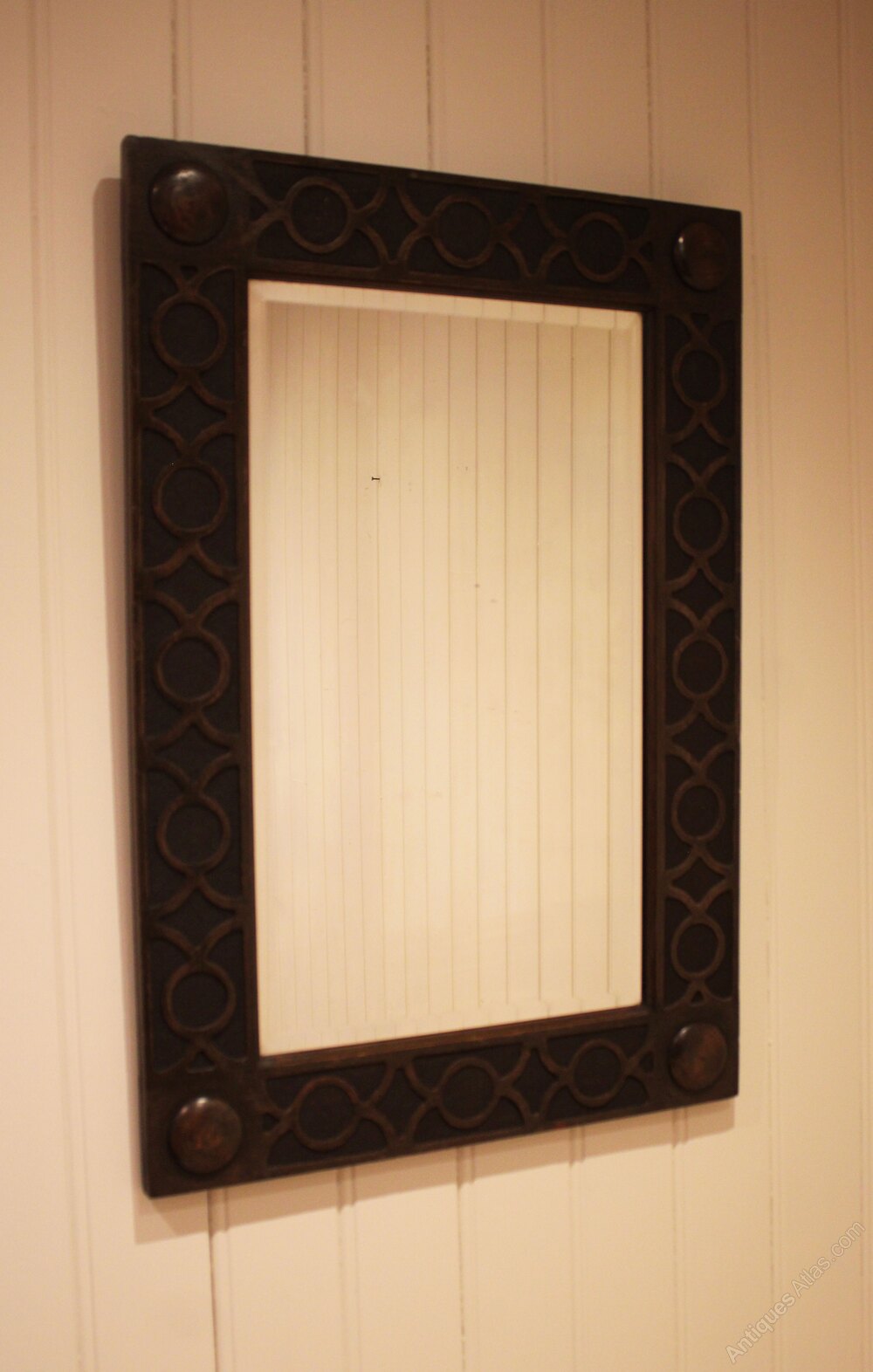 Edwardian solid oak wall mirror having a decorative carved decoration , with an inset bevel edge mirror.