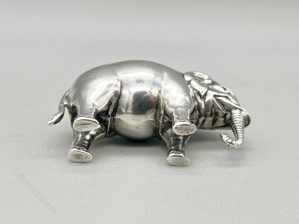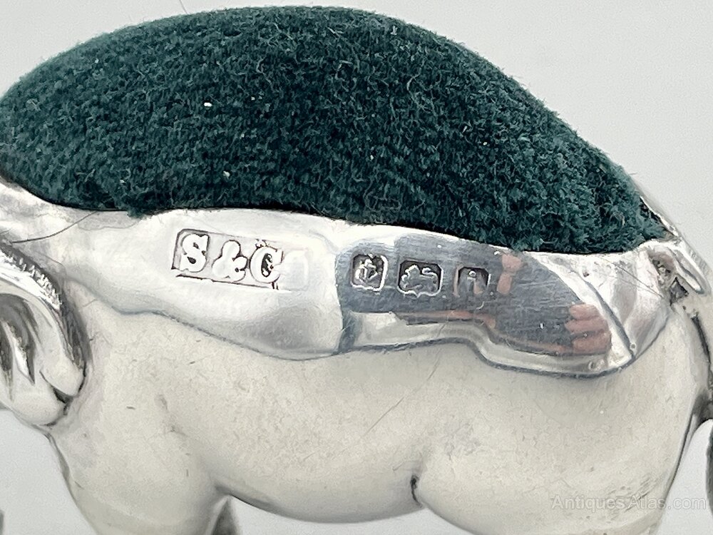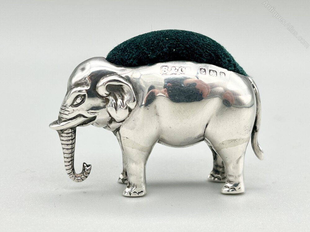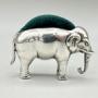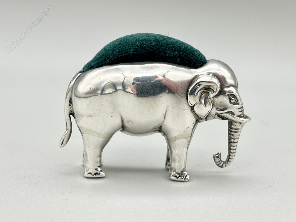 Here we have a charming Edwardian Sterling Silver Pin Cushion in the form of an Elephant. The elephant is nicely modelled and weighted for stability. The green velvet pin cushion is inset in the elephant's back.