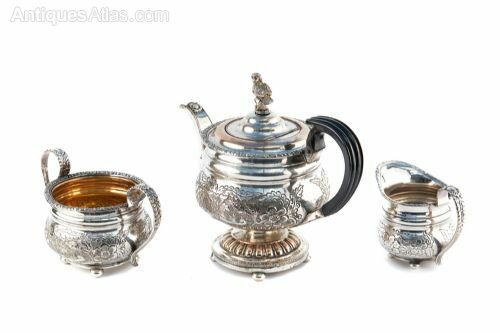 Quality antique Edwardian Silver Plated three piece Tea Set, the teapot having an unusual owl finial, black shaped handle and standing on a pedestal circular base with bun feet. All three pieces of the set having the same ornate decoration of leaves and flowers to the bodies and handles.