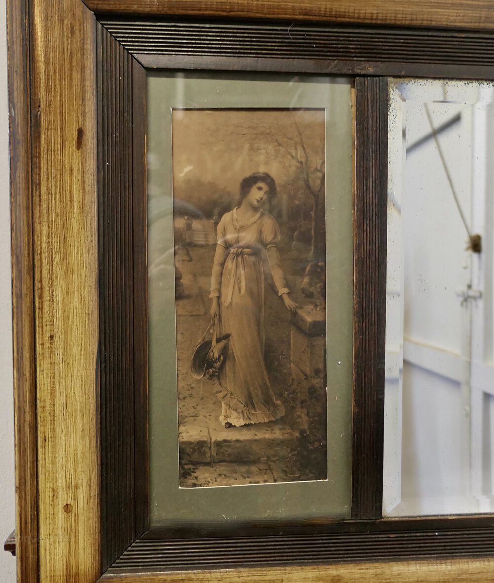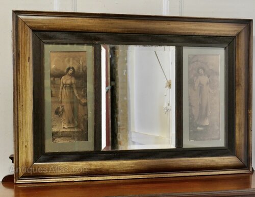 This is a lovely decorative piece, the long 3” scumble finish frame has a central bevelled mirror bordered with very early 20th Century prints on each side